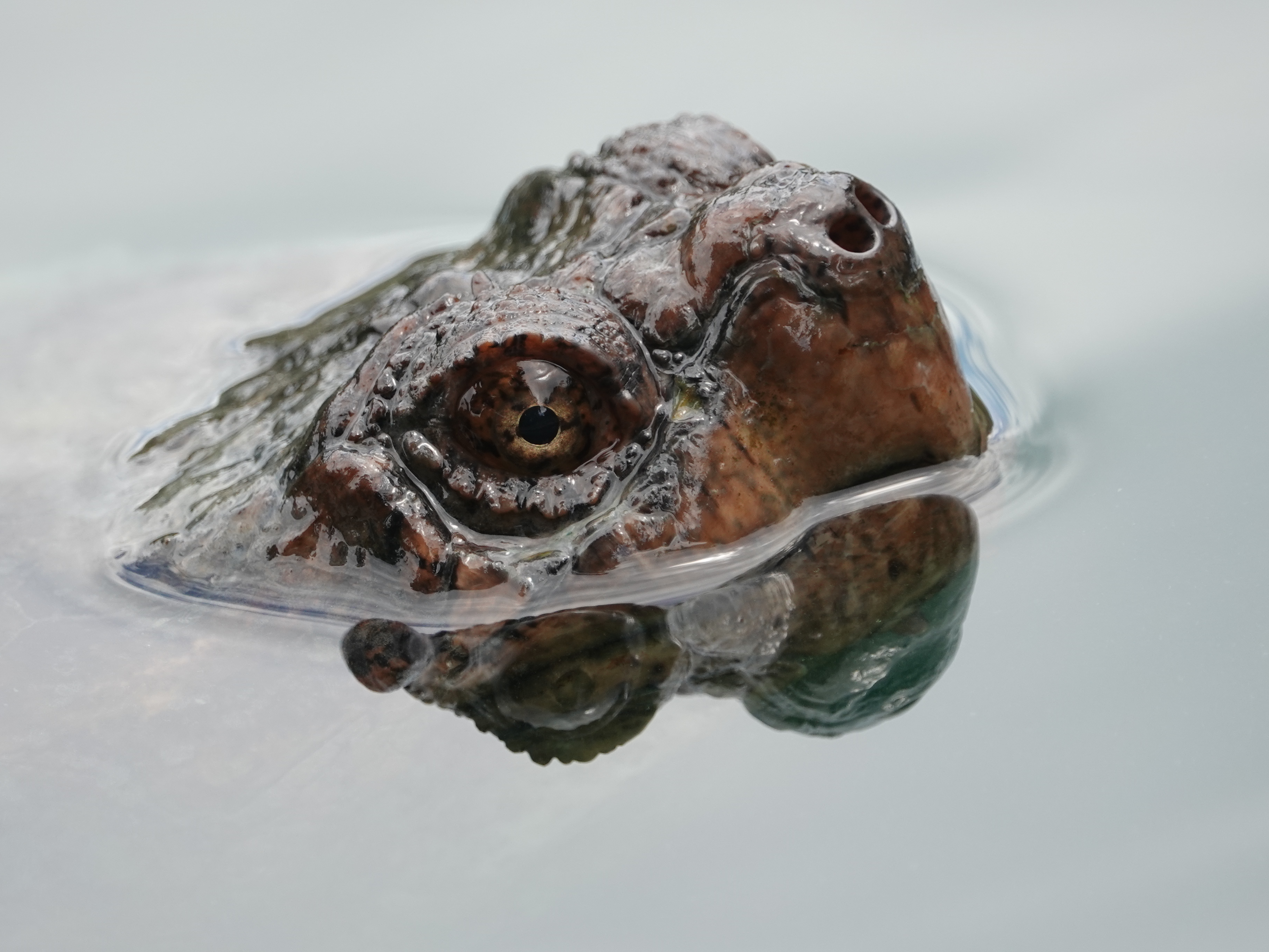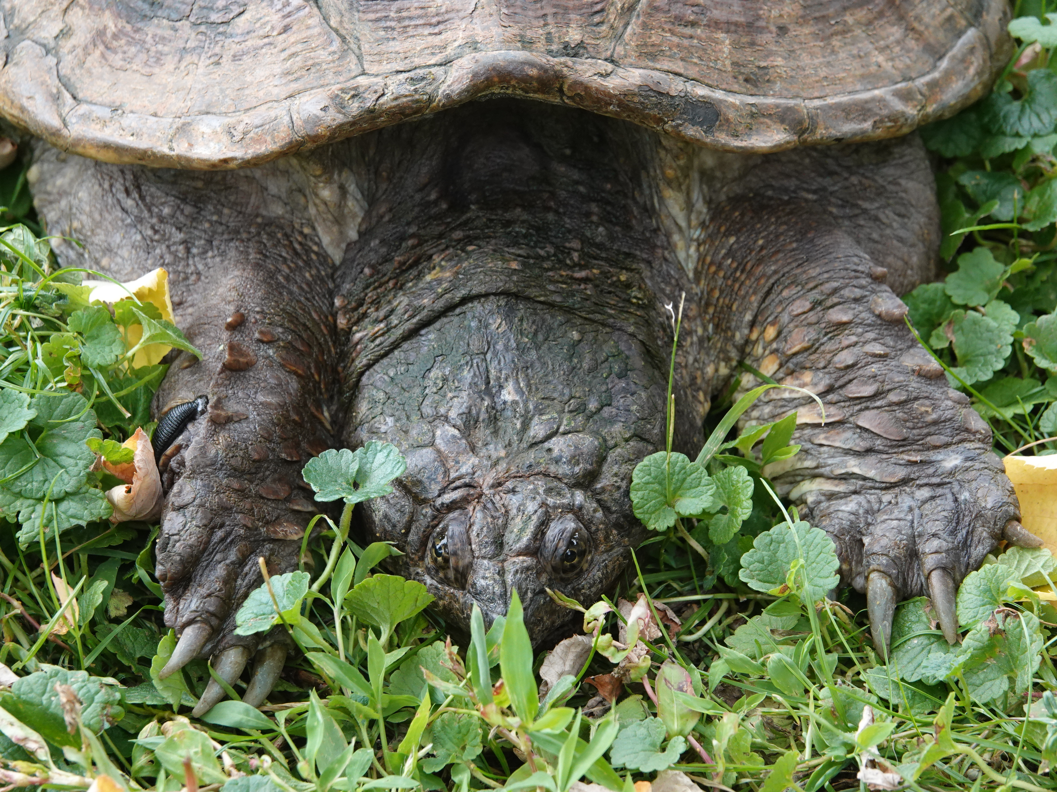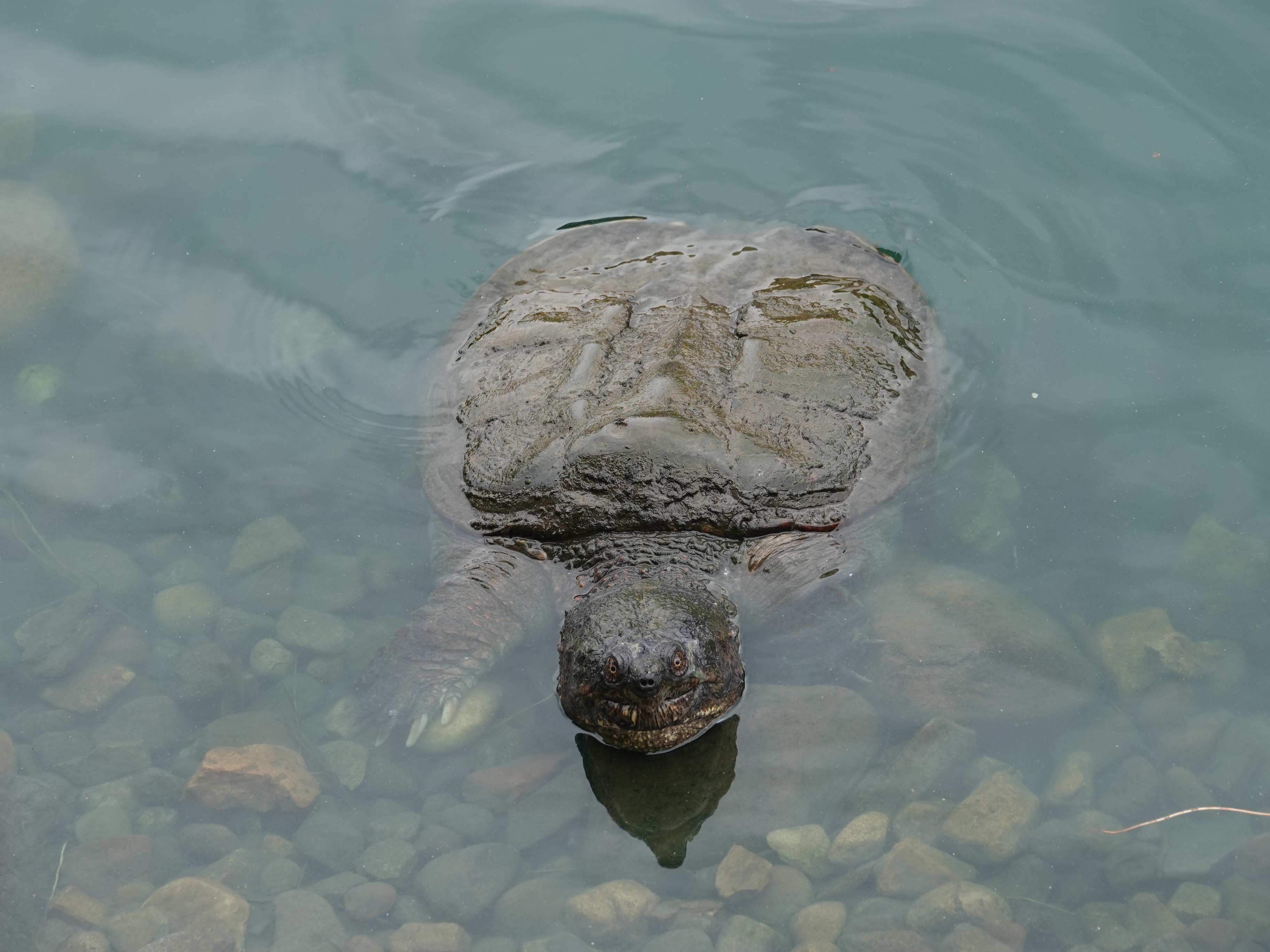 A few Common Snappers have been released into this pond, with permission, from an animal rescue organization. And although wildlife shouldn’t be fed, they are, and hence tend to come up begging.