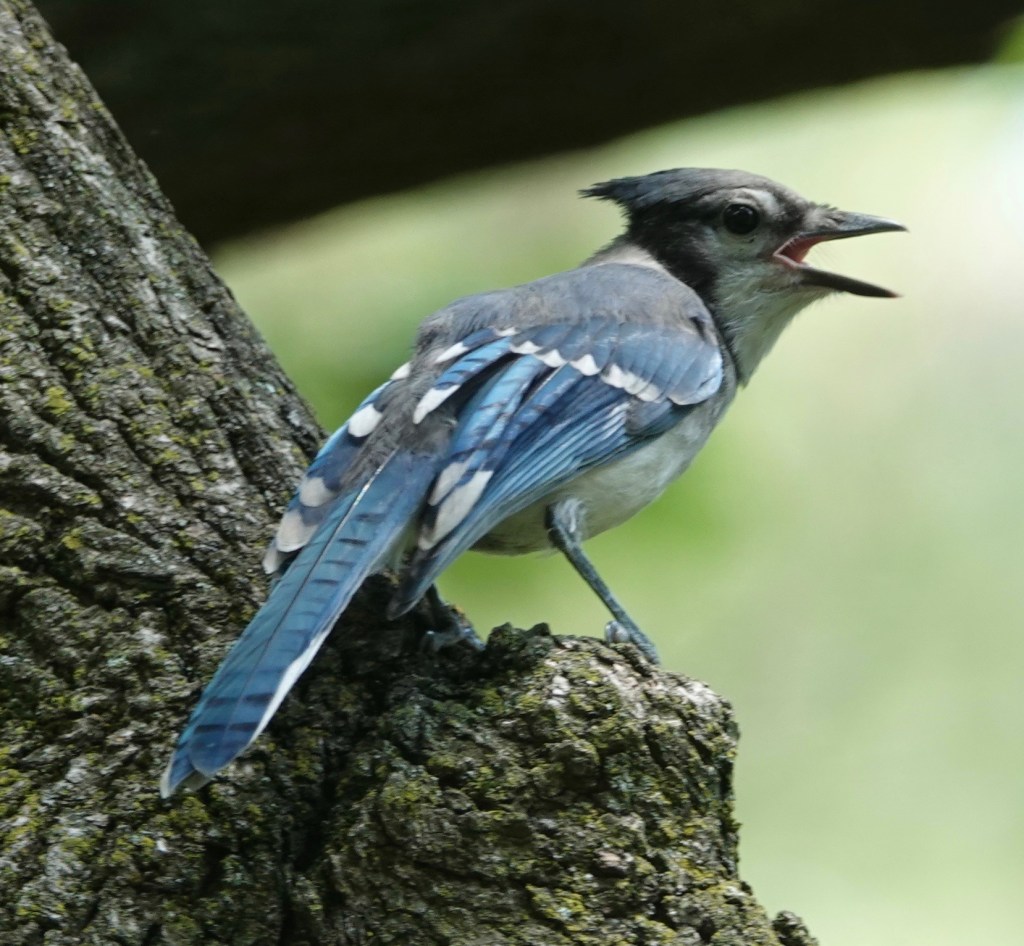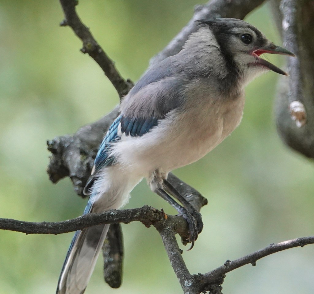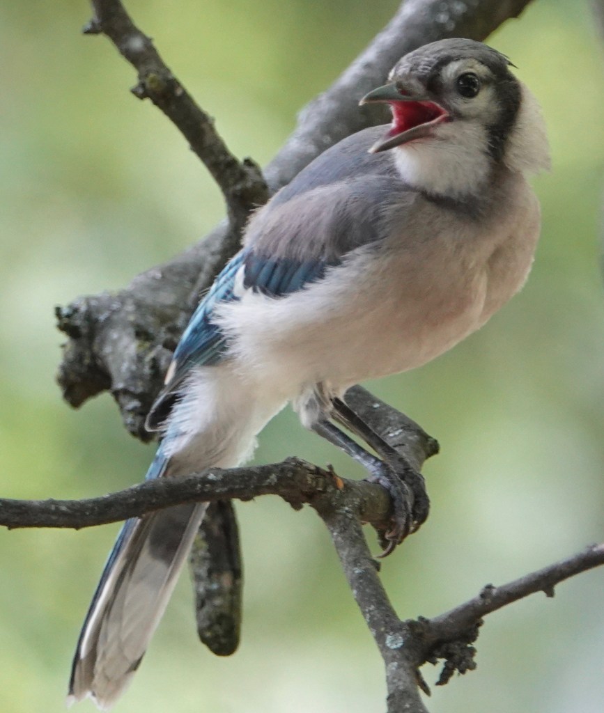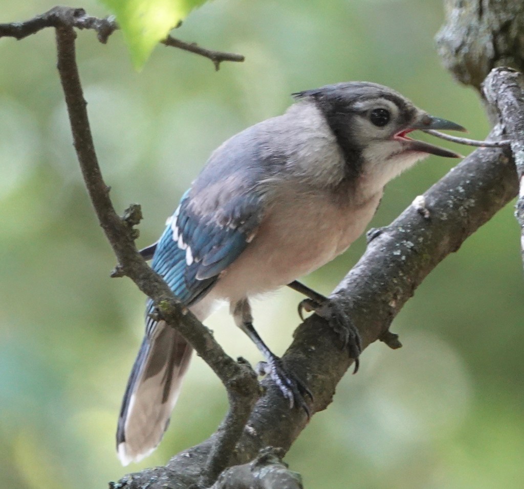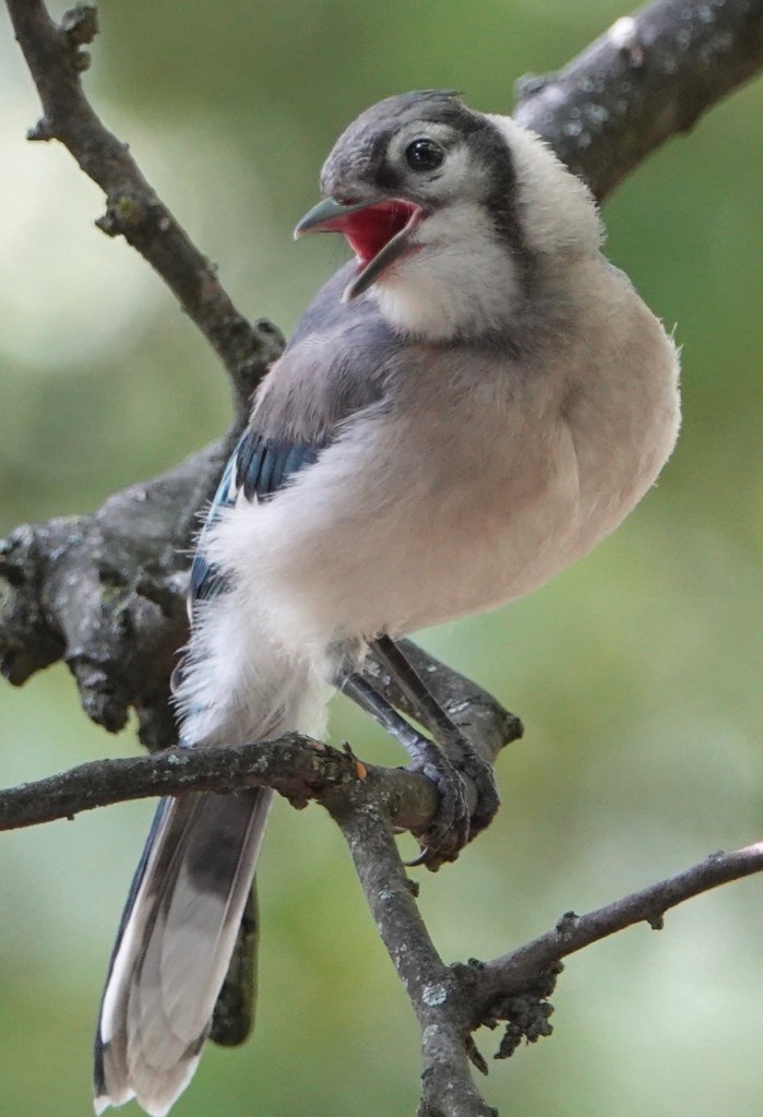 Second fledgling. For Blue Jays, these youngsters were being very vocally subtle. They hopped along branches like monkeys. As soon as I was out from under the drip line of this big maple, the sounds ramped up explosively.