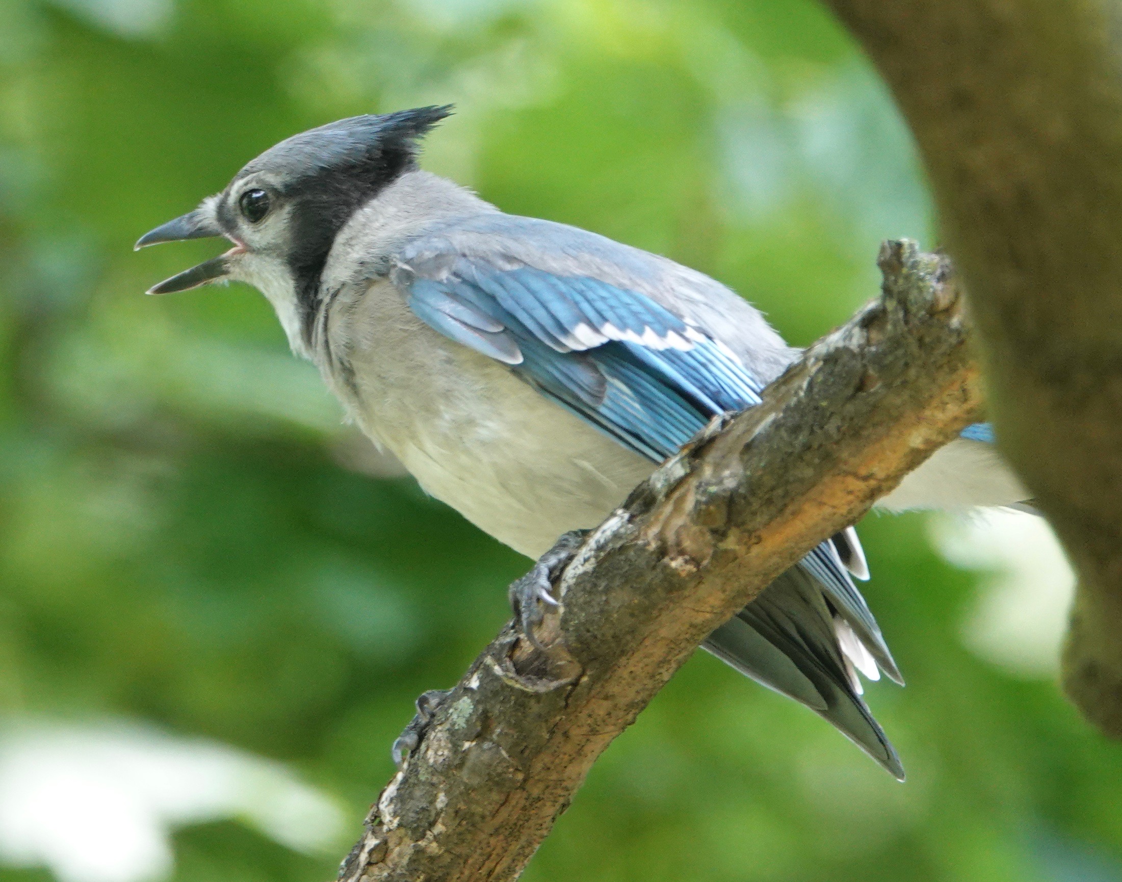 Second fledgling. For Blue Jays, these youngsters were being very vocally subtle. They hopped along branches like monkeys. As soon as I was out from under the drip line of this big maple, the sounds ramped up explosively.