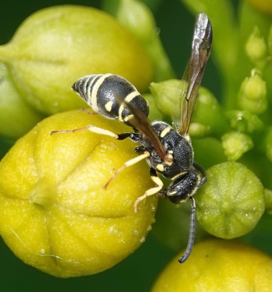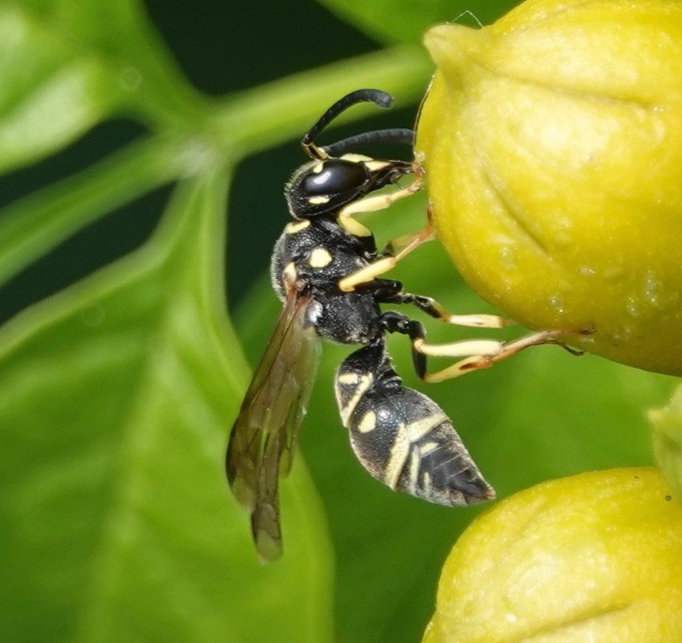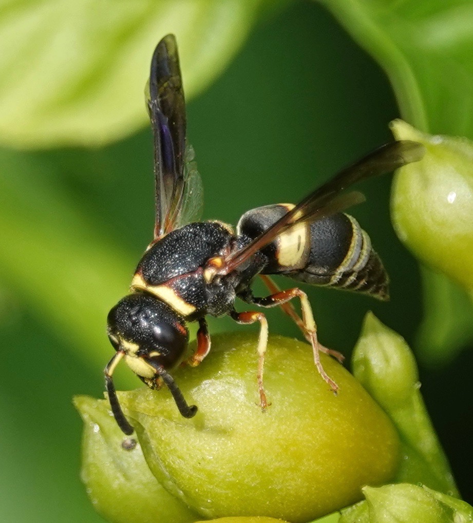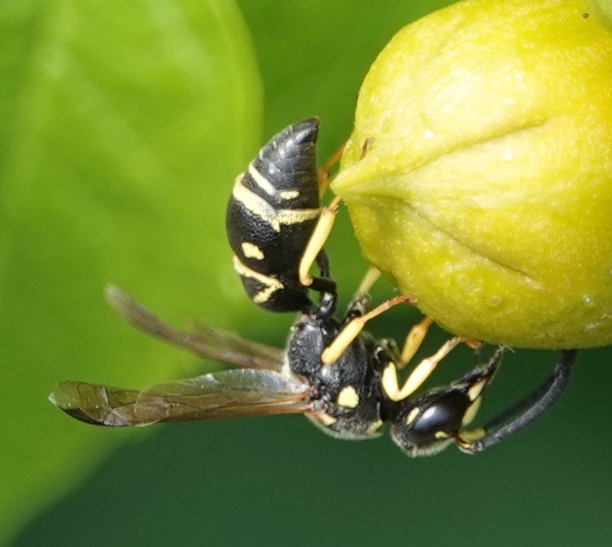 These potter wasps are licking up nectar produced by American Trumpet Vine buds before they bloom. Such extraflora nectaries are a huge hit with wasps, bees, ants, beetles, and other critters. Find a good patch of this wall-covering plant, and appeal of sugary carbohydrates will never again be obscure.