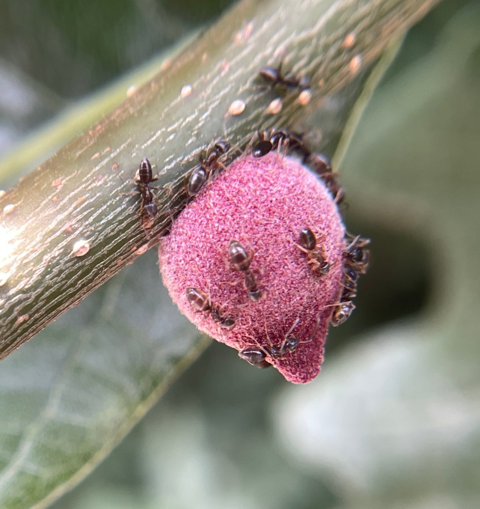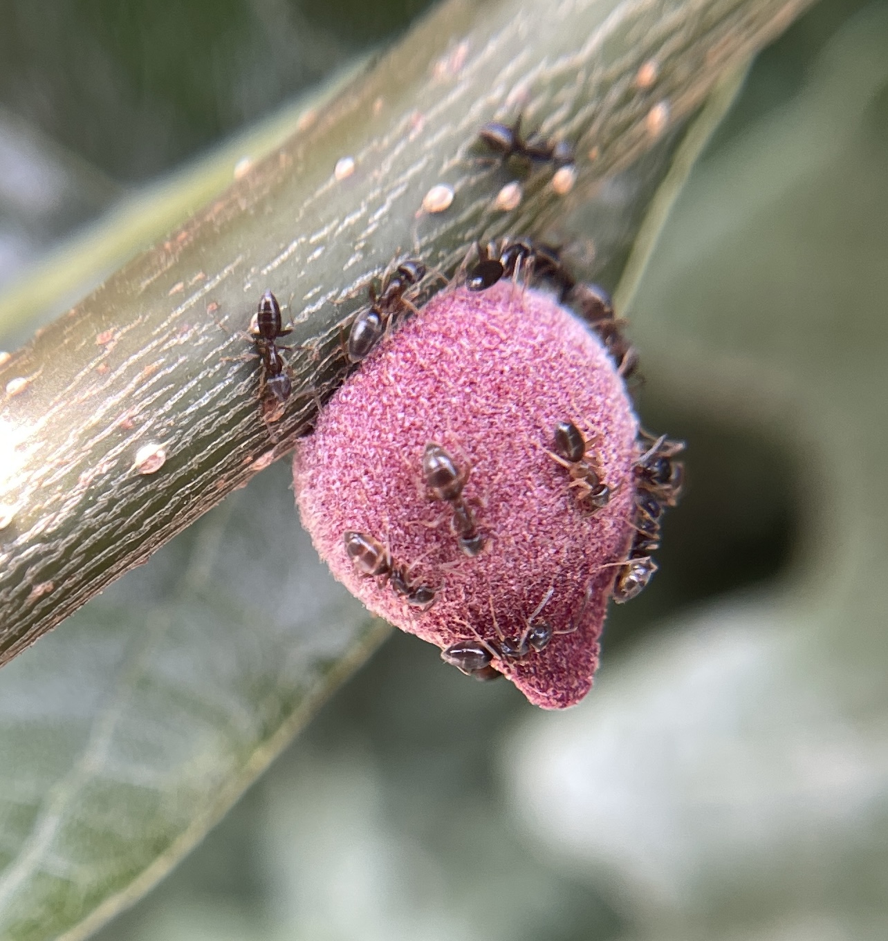 Some galls, like this Rough Bulletgall Wasp/Disholcaspis quercusmamma on Swamp White Oak/Quercus bicolor, produce nectar as well. These Odorous House Ants/Tapinoma sessile were not best pleased when I tried to move some leaves out of the way…
