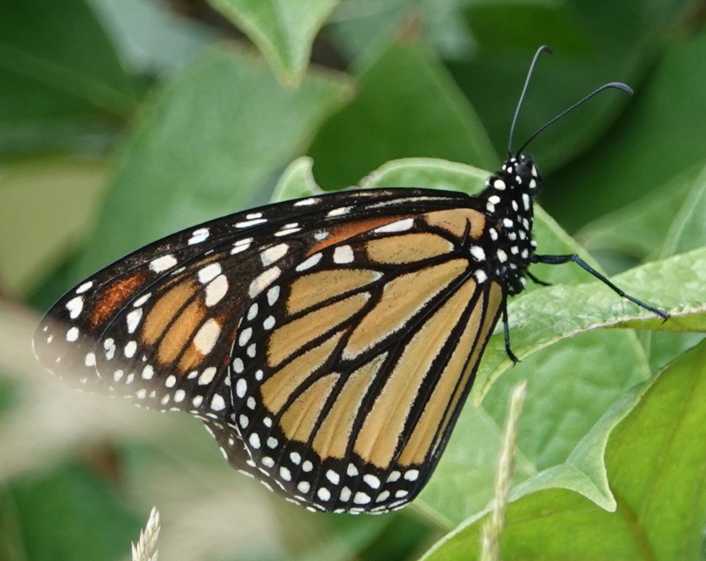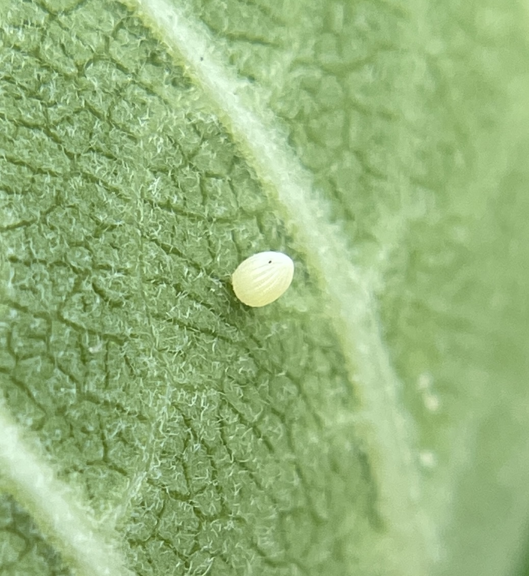 A Monarch egg on the underside of Common Milkweed.