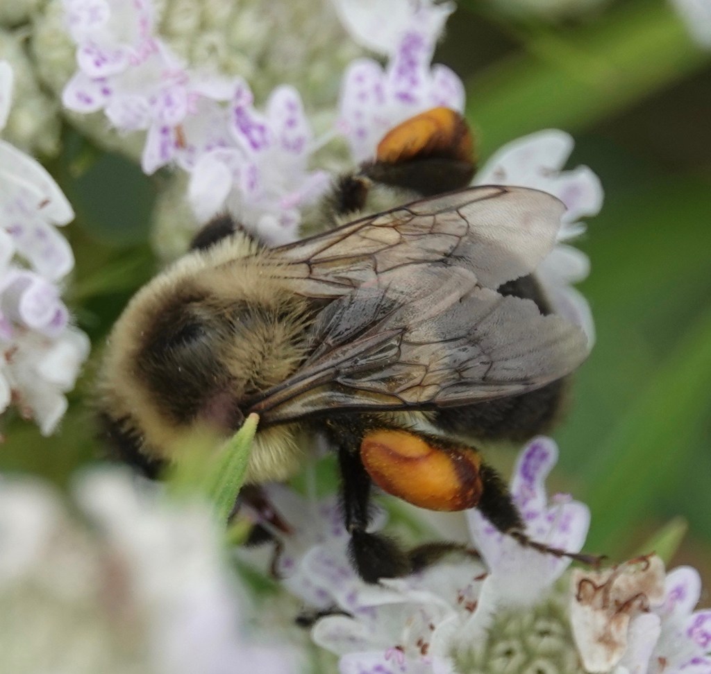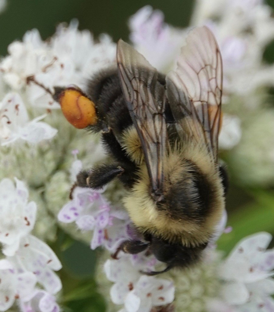 The color of these pollen bundles! Not sure if the pollen is all from these mountain mints, in bloom now and virtual crack for pollinators, or a mix of flowers, but the pattern is delicious.