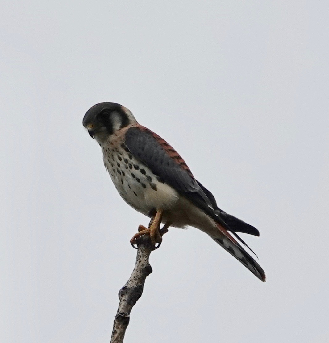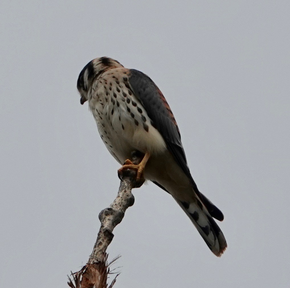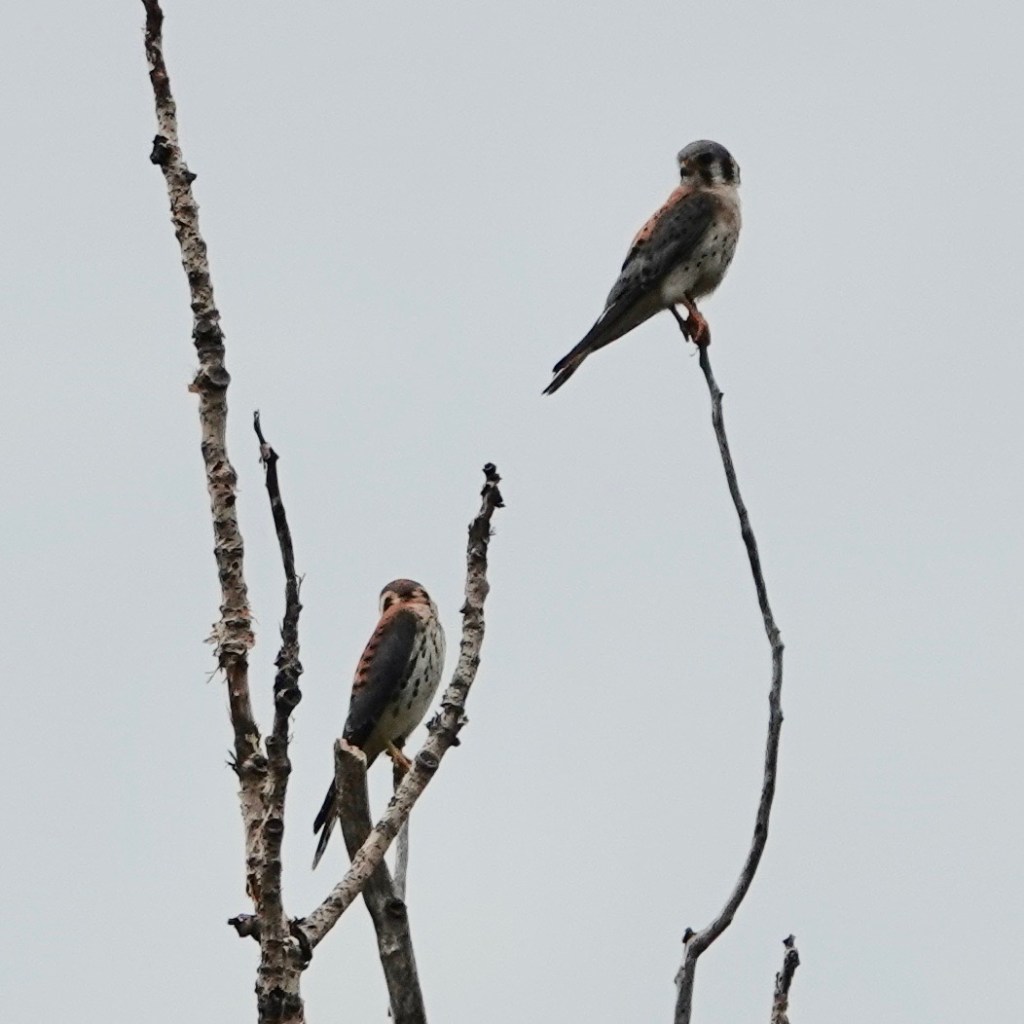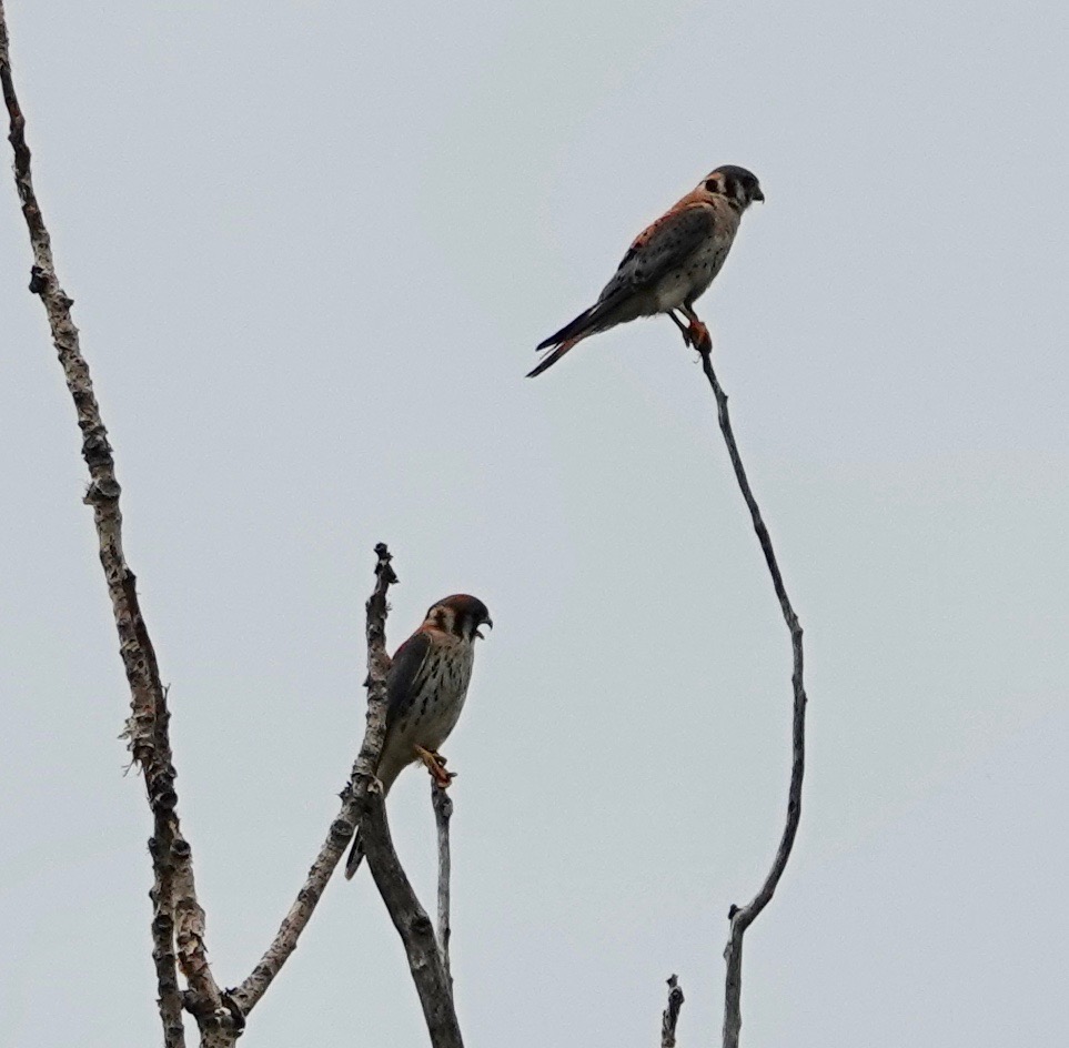 Two male American Kestrels. The lower one, whining incessantly, was a begging juvenile.