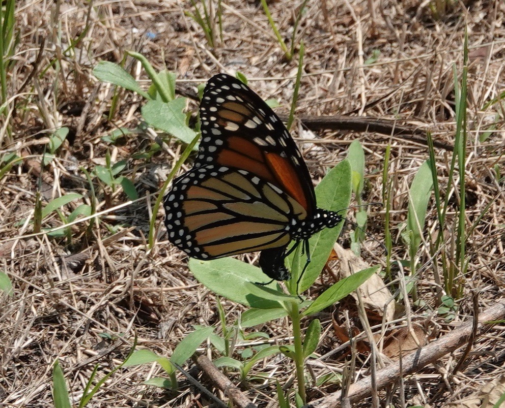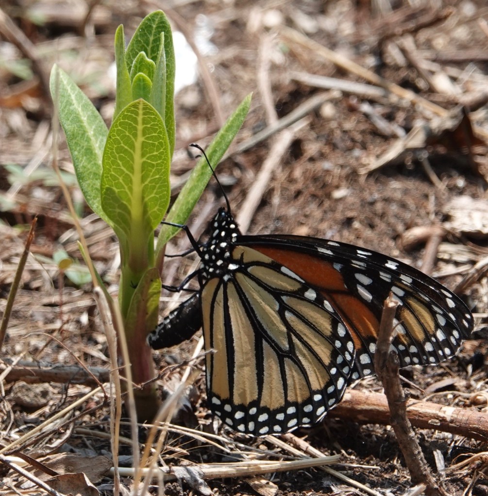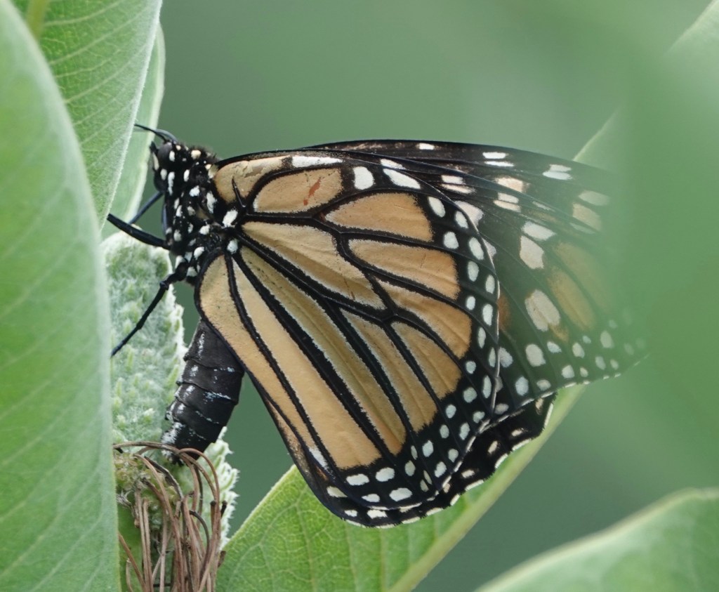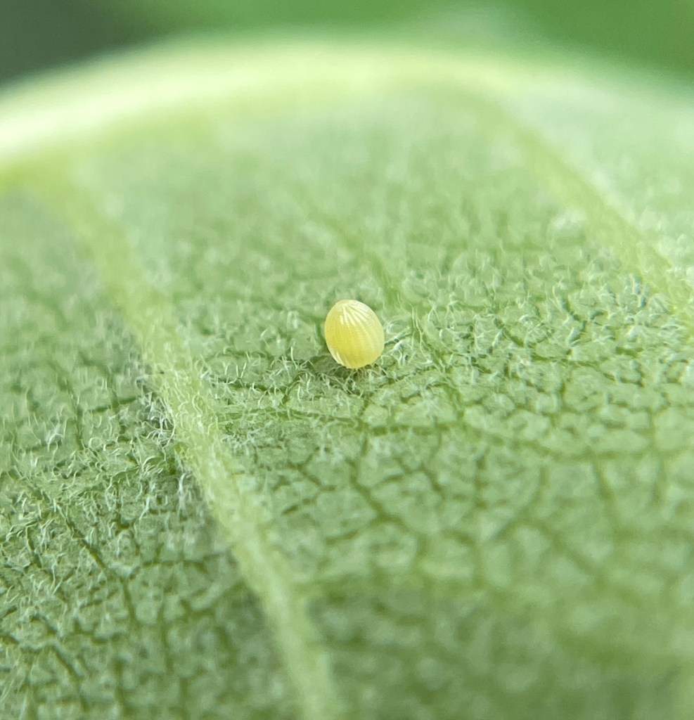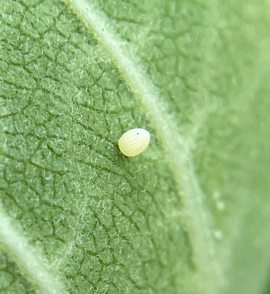Female ovipositing on Common Milkweed pod. Have not seen this before: usually they lay on the underside of the leaves.