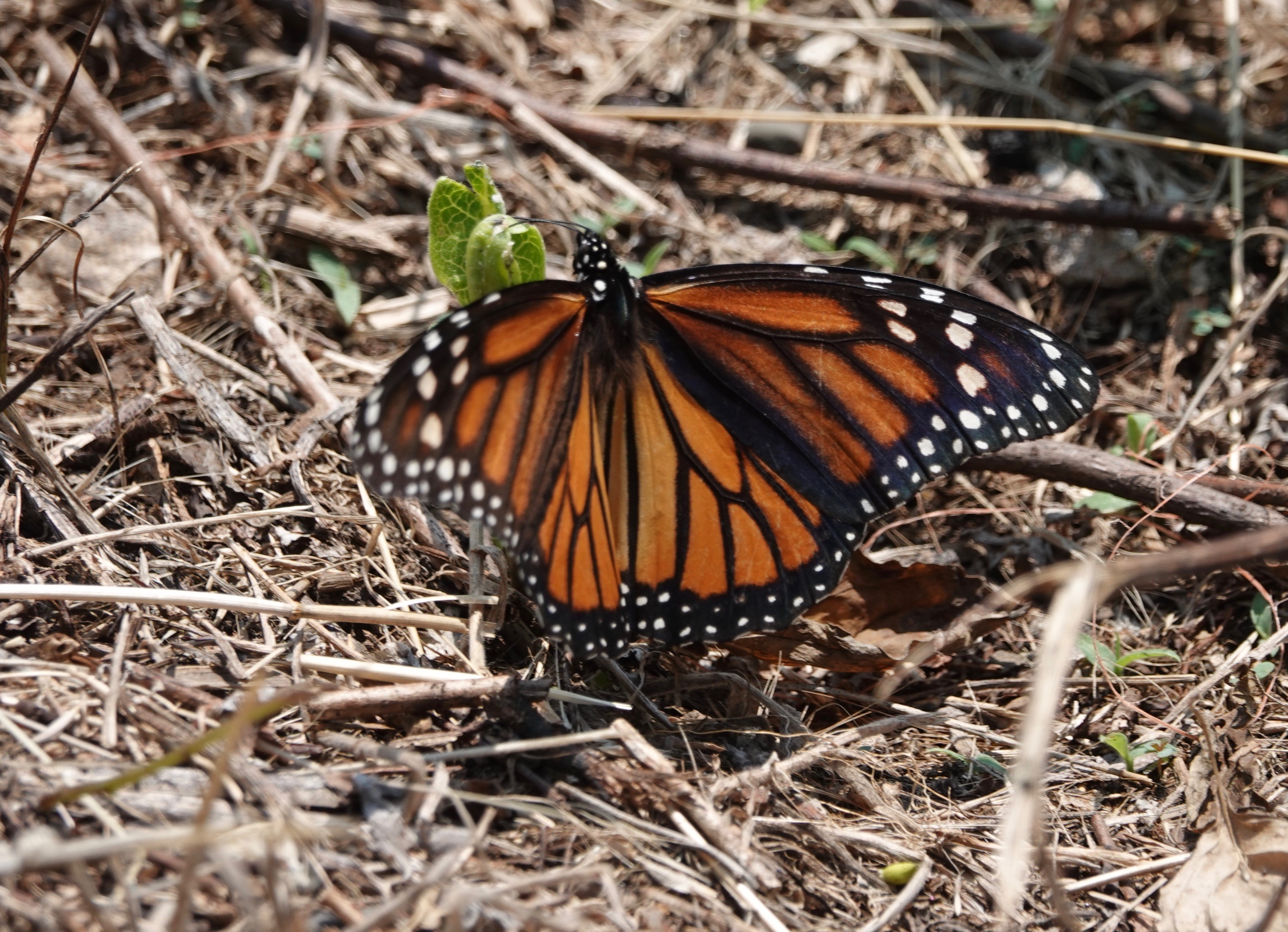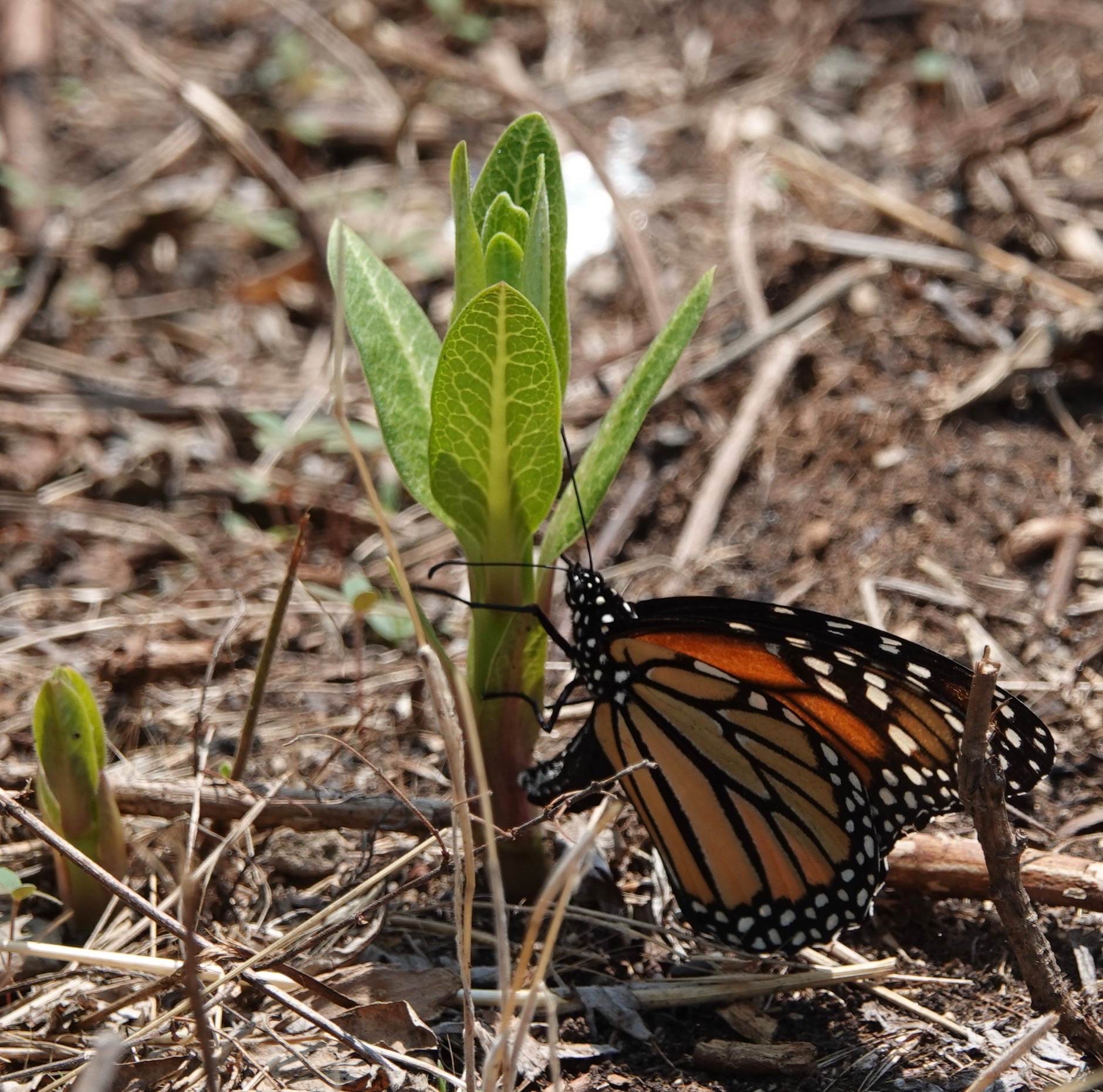 Female ovipositing on Common Milkweed pod. Have not seen this before: usually they lay on the underside of the leaves.