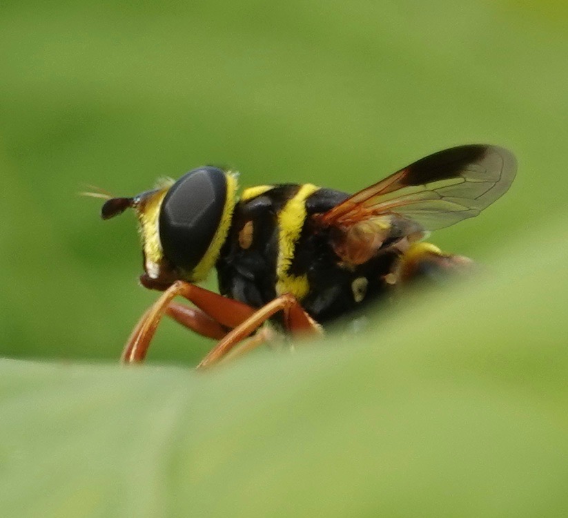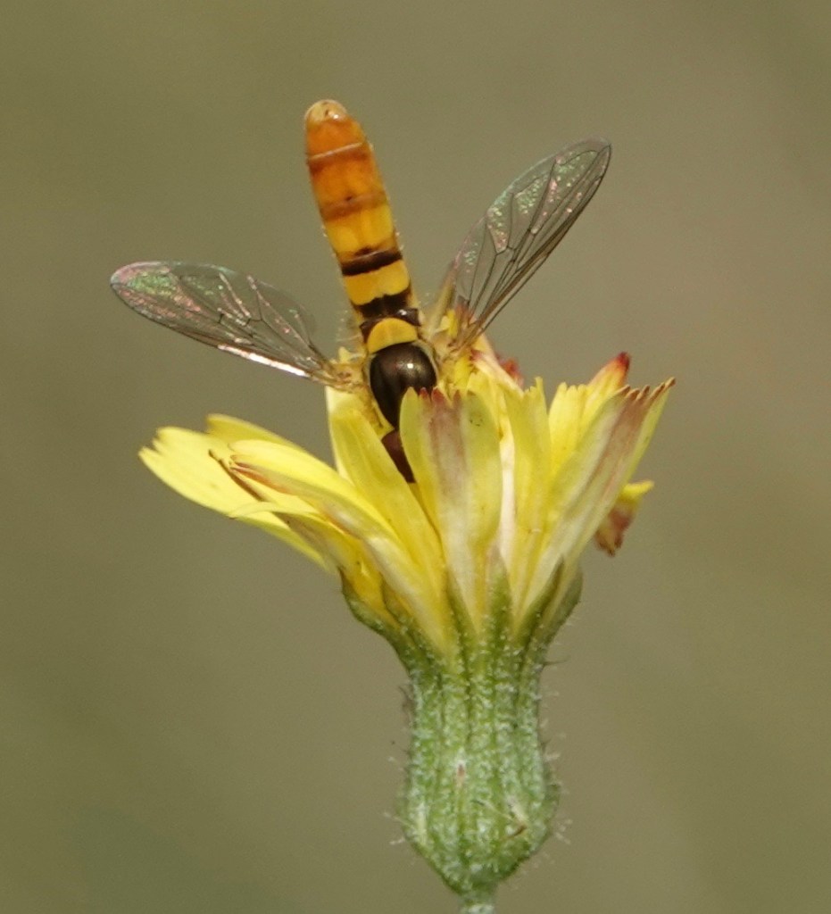 Carolinian Elegant/Meromacrus acutus–a wasp-mimicking fly usually found further south. This is the second NY state iNat observation, the first being seen a bit further up the Hudson two days earlier.