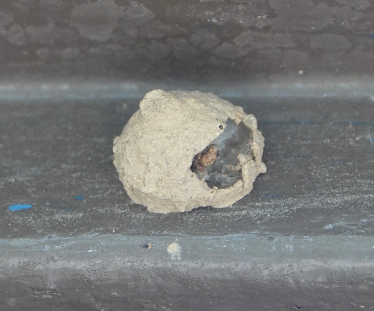 Incomplete Yellow-legged Mud-dauber Wasp/Sceliphron caementarium nest. Inside public bathroom, facilities which have also hosted the mud-nests of Common Blue Mud-dauber Wasp/Chalybion californicum and Eumenes genus potter wasps. A perpetually open window and gaps in the window frame fan allow them all in an out, laden with mud balls and spider prey.