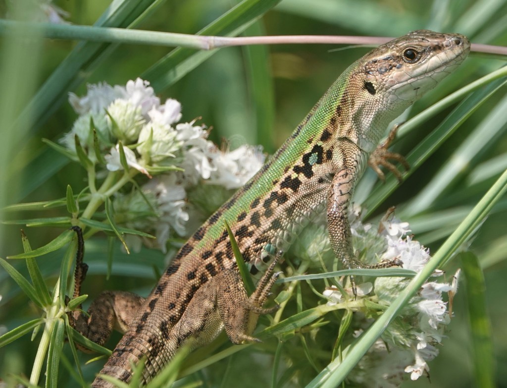 ! Northern Italian Fence Lizard/Podarcis siculus ssp. campestris. A ringer: not so much feeding on the flowers are using as a lookout, and perhaps hunting for visiting insects.