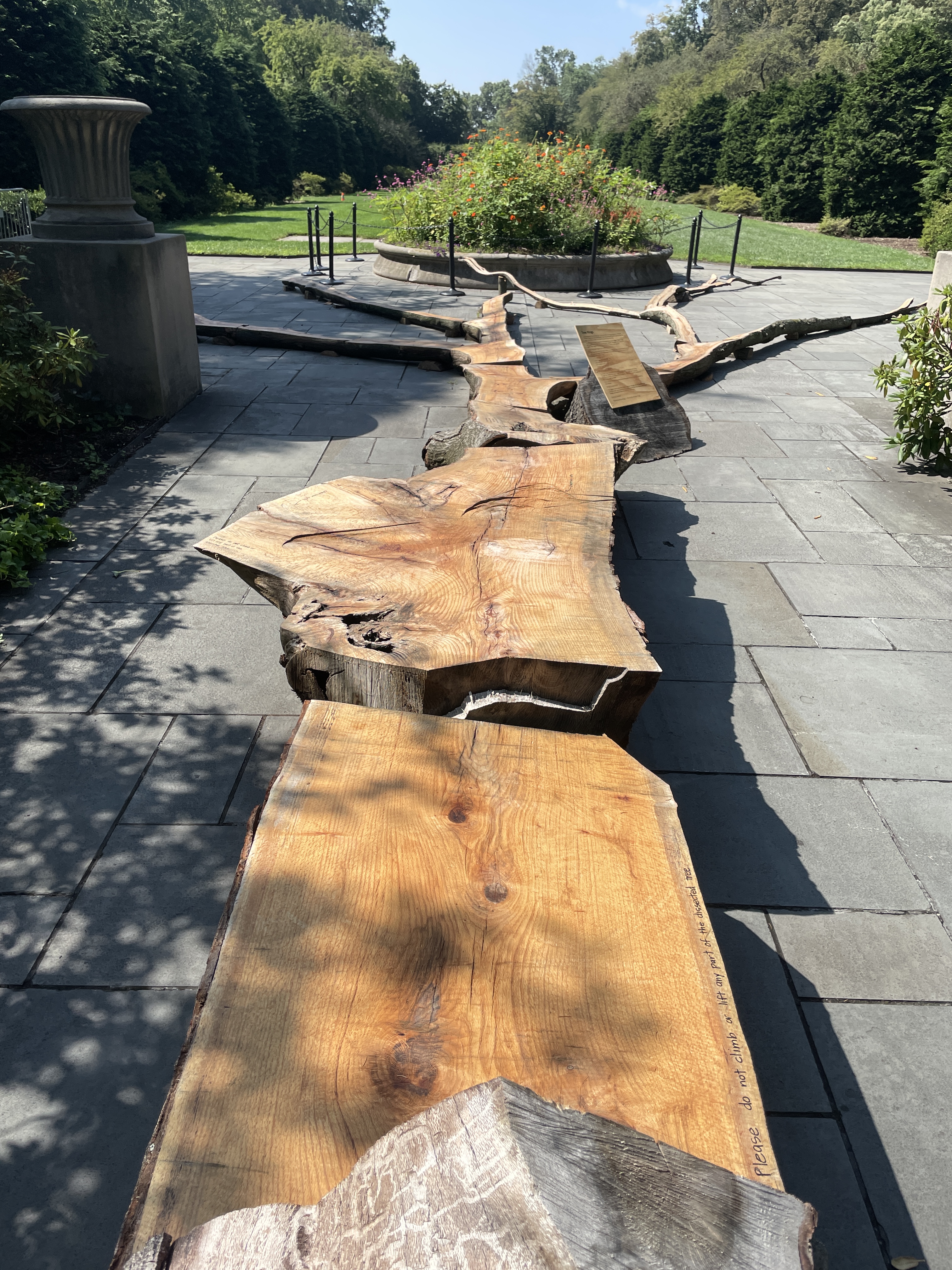 Just inside the Brooklyn Botanical Garden’s Eastern Parkway entrance is a Pin Oak/Quercus palustris brought down intentionally because of disease/safety. They’ve split the tree vertically and displayed it horizontally.