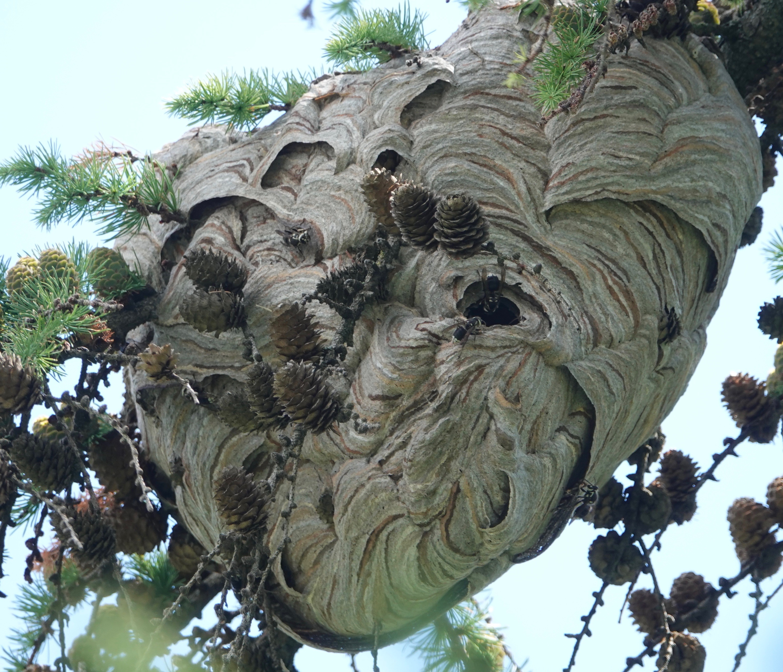 The wood pulp collected this way is the basis for the paper that makes up the enveloping structure of the nest as well as the comb within. This is nearby nest in a larch–perhaps the nest this worker was collecting for, perhaps not, as this is common species here.