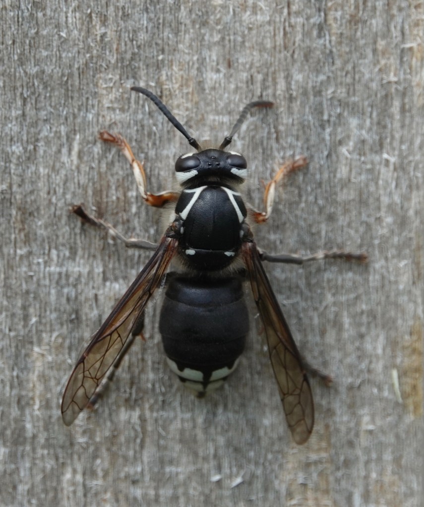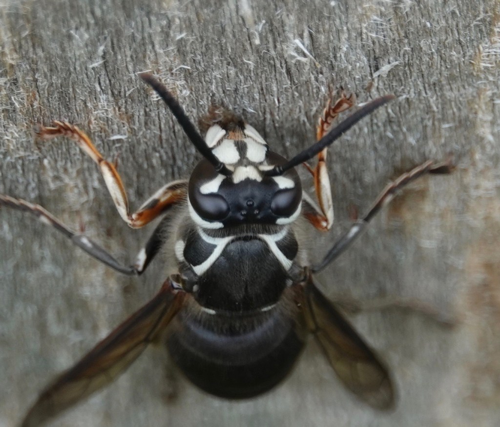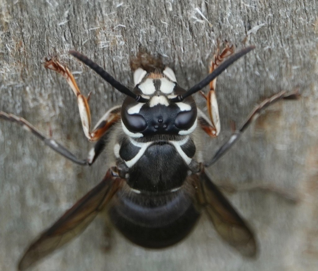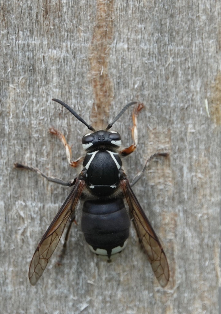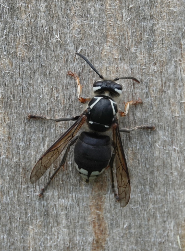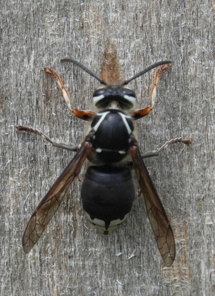 After scraping about a body’s length of wood pulp off a sapling-supporting pole, this Bald Faced Hornet/Dolichovespula maculata moved upwards about a body’s length to start again: