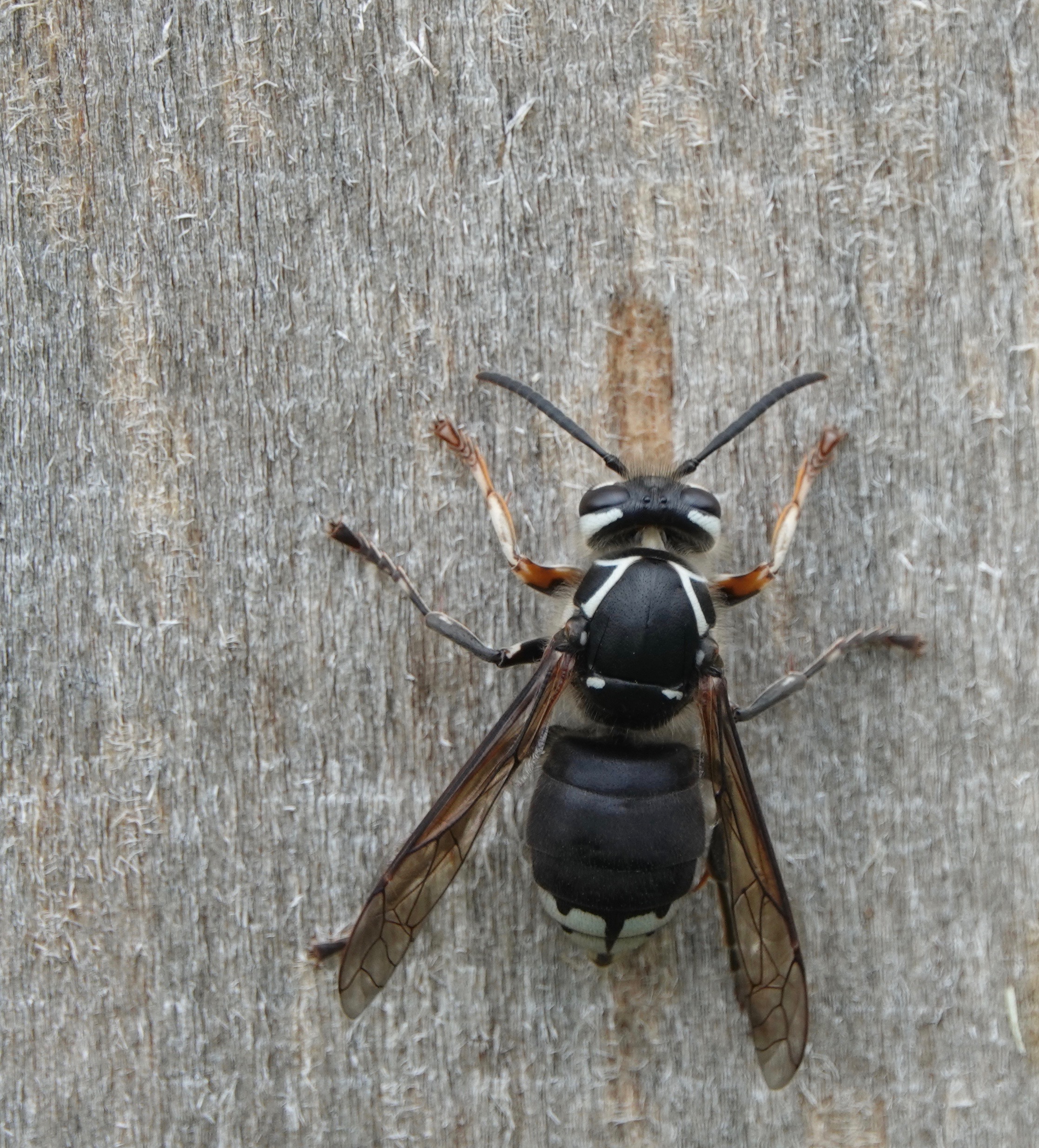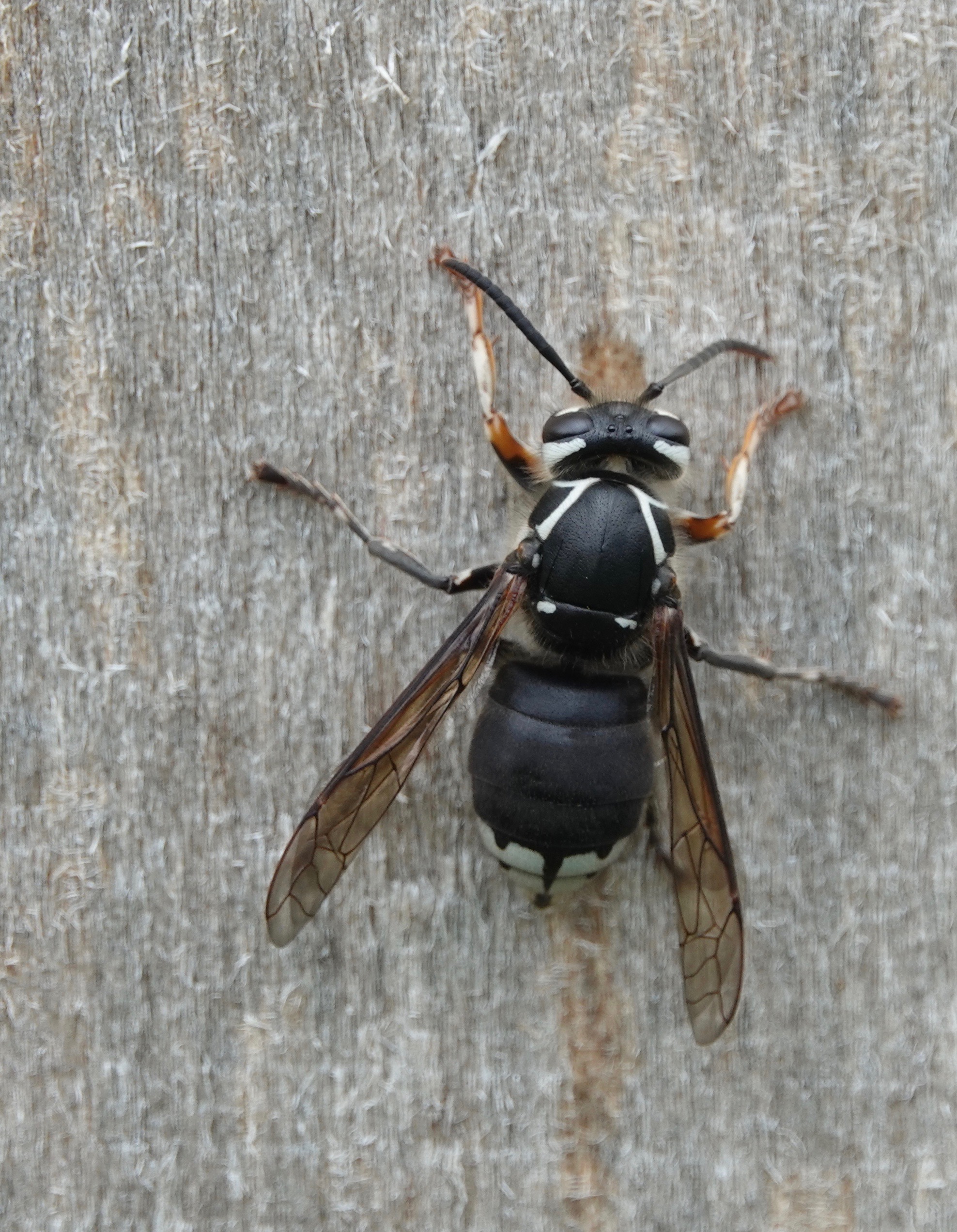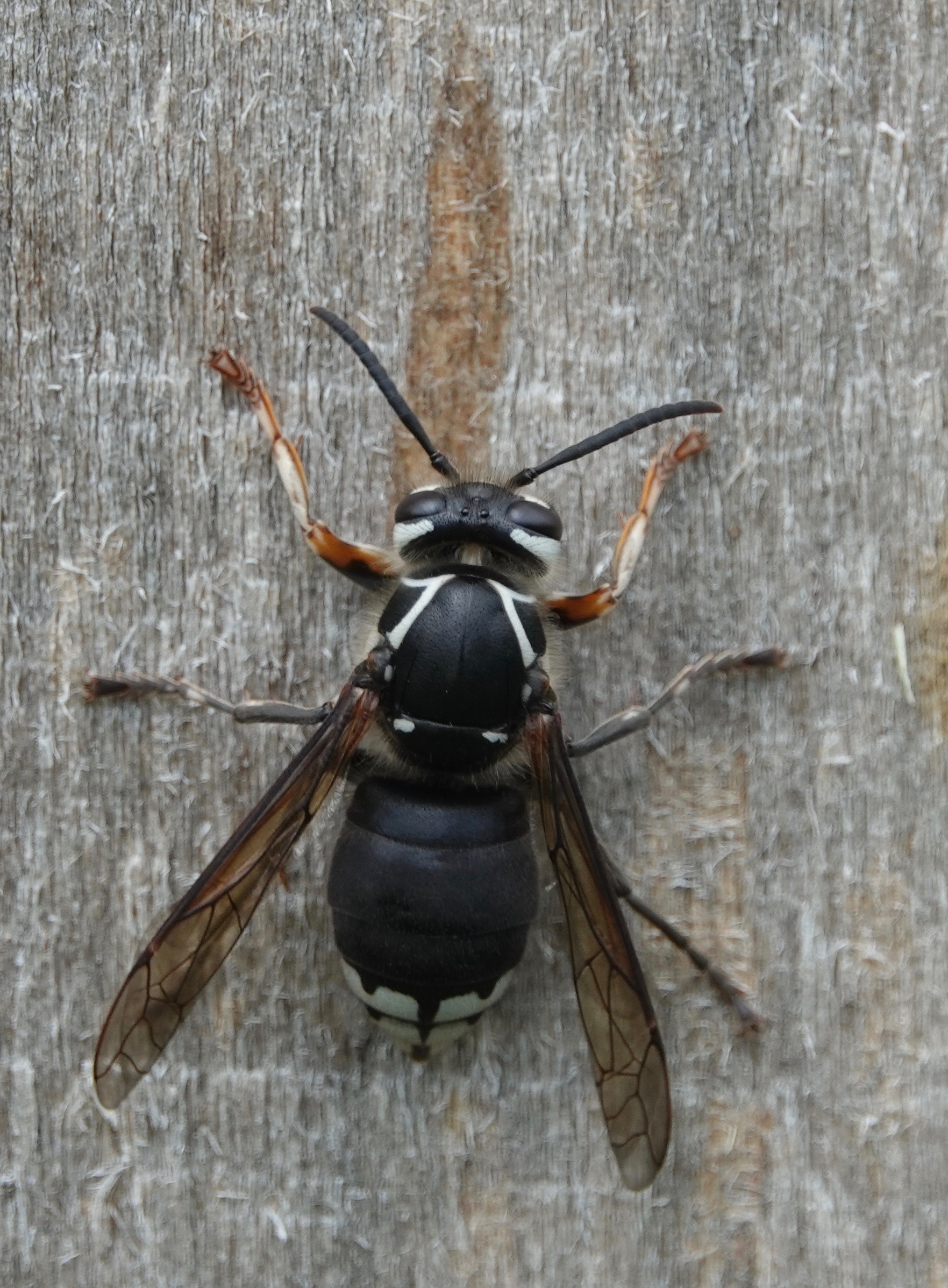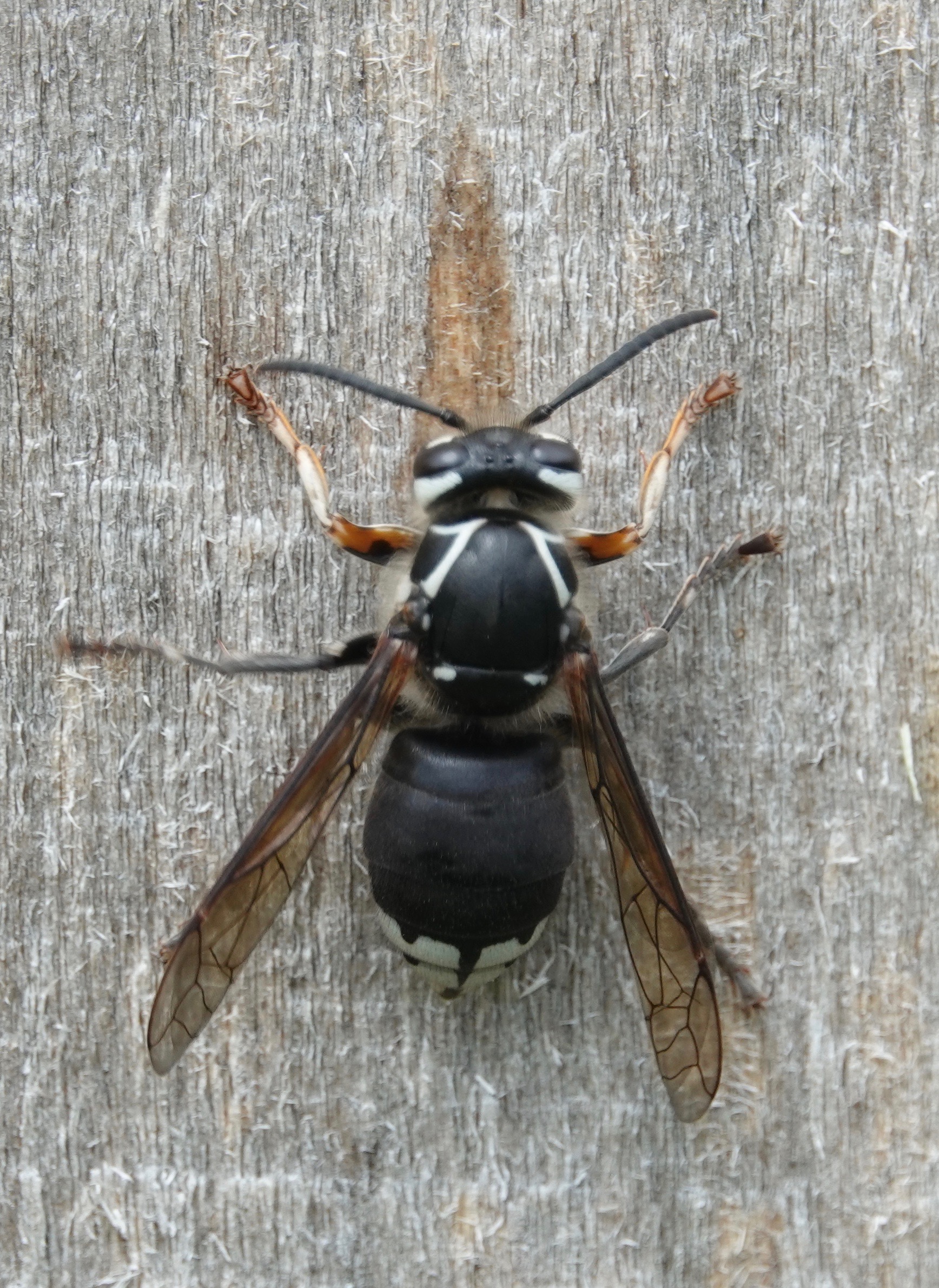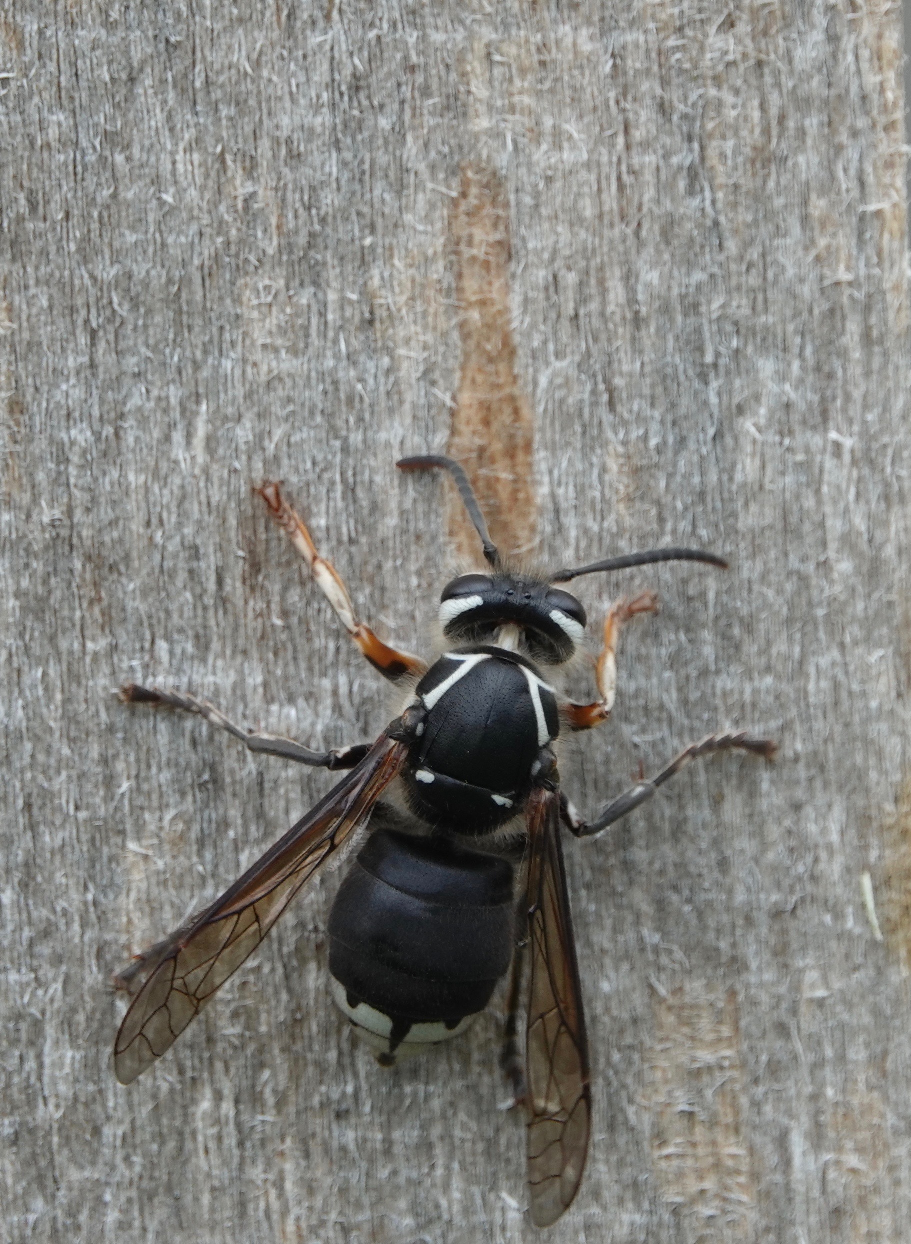 After scraping about a body’s length of wood pulp off a sapling-supporting pole, this Bald Faced Hornet/Dolichovespula maculata moved upwards about a body’s length to start again: