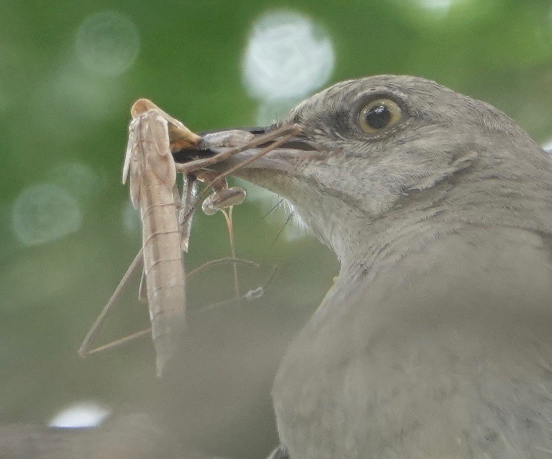 But no, this Northern Mockingbird definitely has a mantid. Predator versus predator…