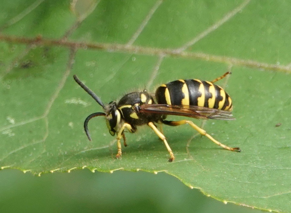Grooming wasp on a leaf. Such yellow and black wasps get called yellowjackets, but that’s not a species-specific term. This one looks like it could be a ground yellowjacket of the genus Vespula. We have at least five Vespula species in NYC, the most common being Eastern/V. maculifrons and the introduced German/V. germanica, which has been in the U.S. since the 1890s.