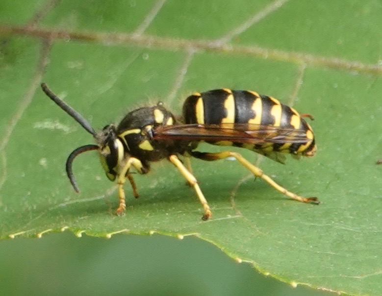 Grooming wasp on a leaf. Such yellow and black wasps get called yellowjackets, but that’s not a species-specific term. This one looks like it could be a ground yellowjacket of the genus Vespula. We have at least five Vespula species in NYC, the most common being Eastern/V. maculifrons and the introduced German/V. germanica, which has been in the U.S. since the 1890s.