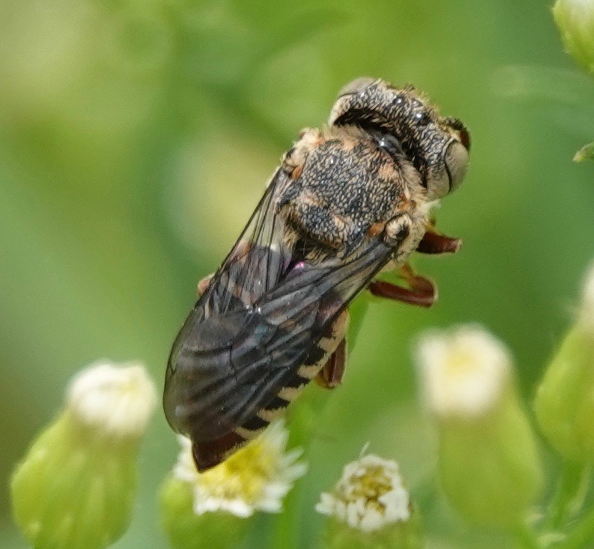 The colorful little Coelioxys coturnix is a recently introduced Eurasian species. They’re a cuckoo species, cleptoparasitic, laying their eggs in Megachile nests. Which Megachile are attacked this way here–does anybody even know yet?