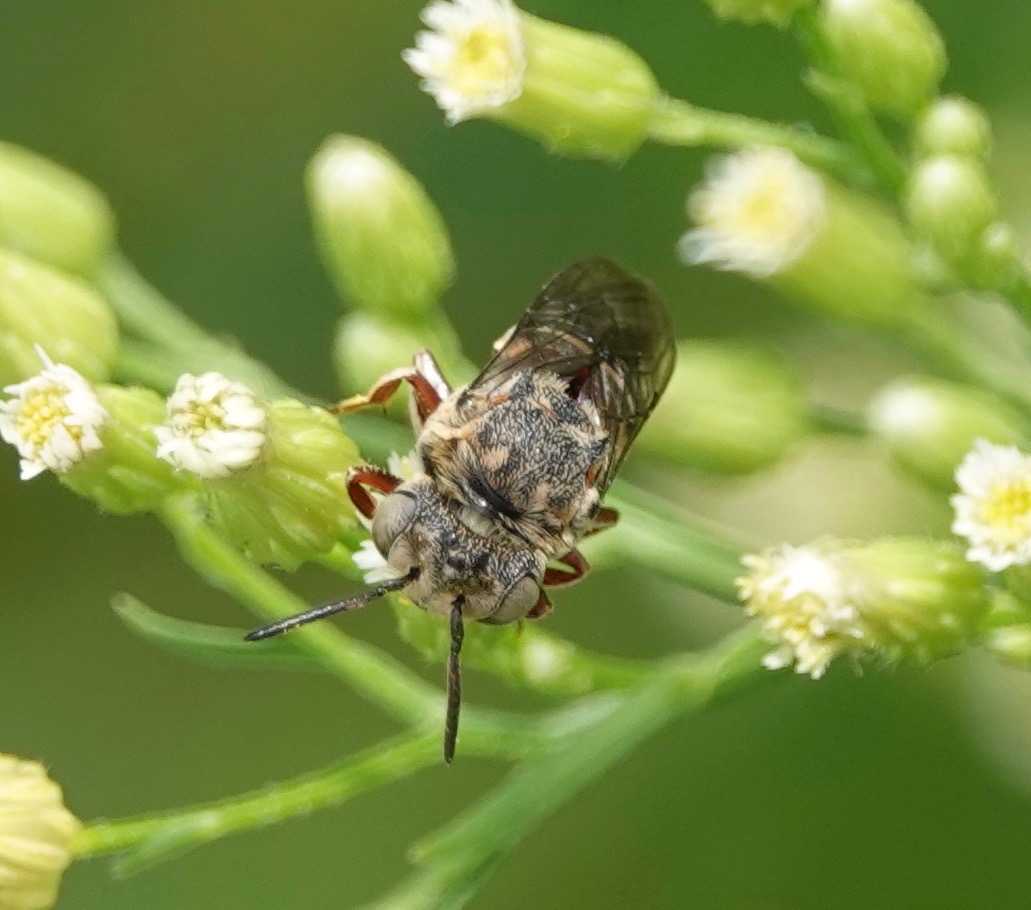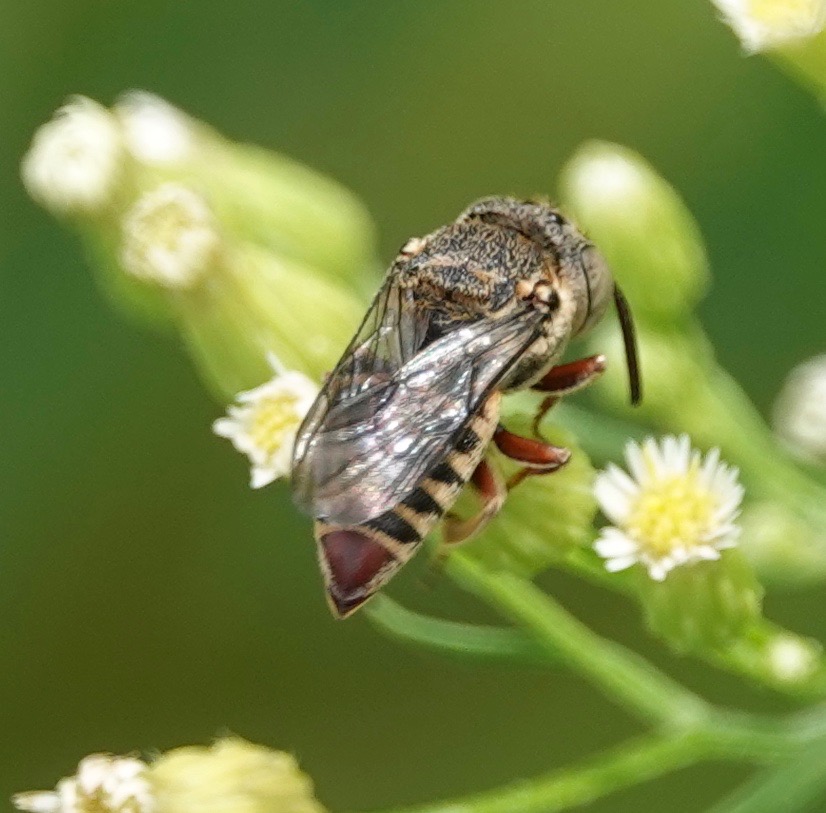 The colorful little Coelioxys coturnix is a recently introduced Eurasian species. They’re a cuckoo species, cleptoparasitic, laying their eggs in Megachile nests. Which Megachile are attacked this way here–does anybody even know yet?