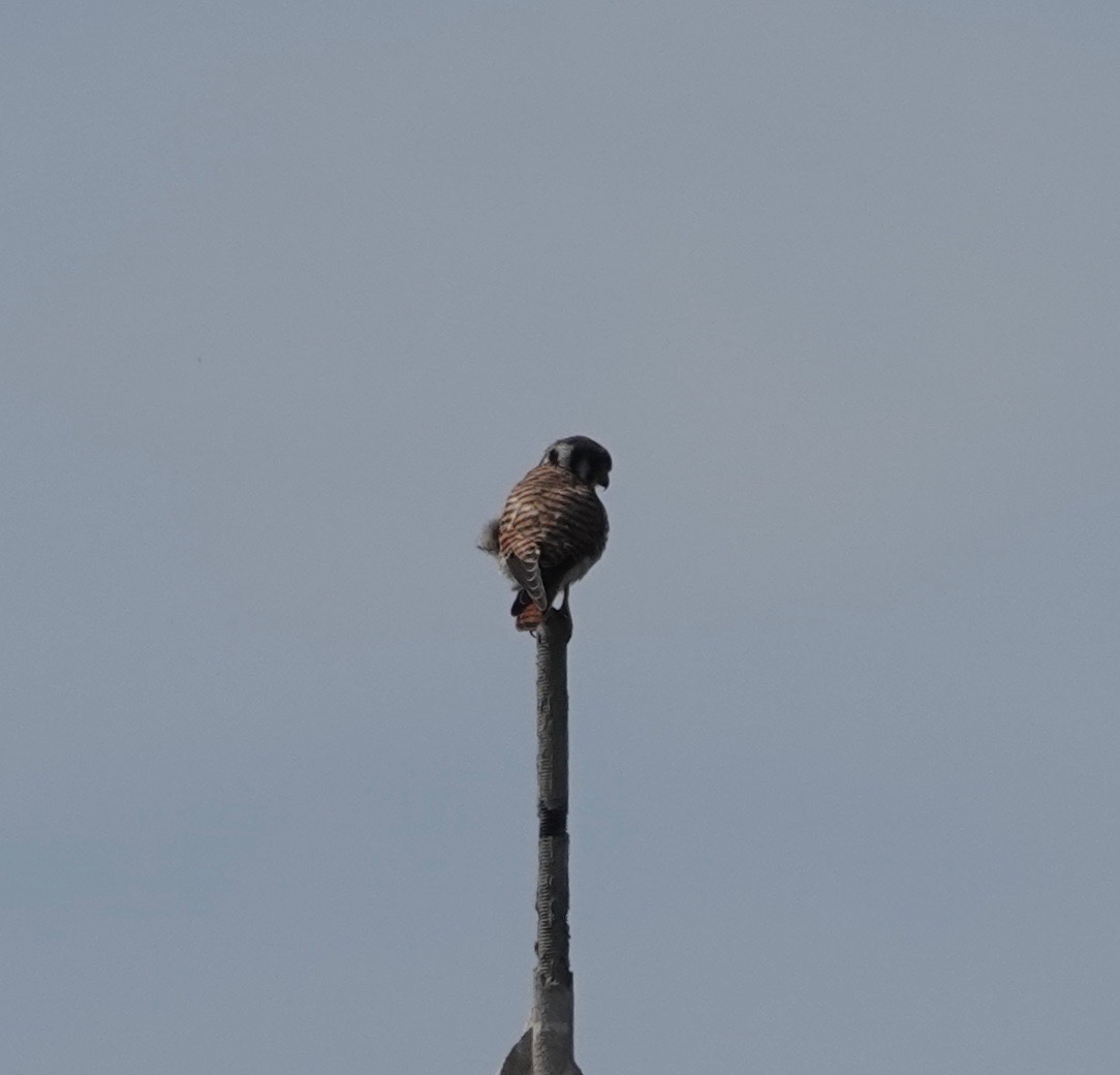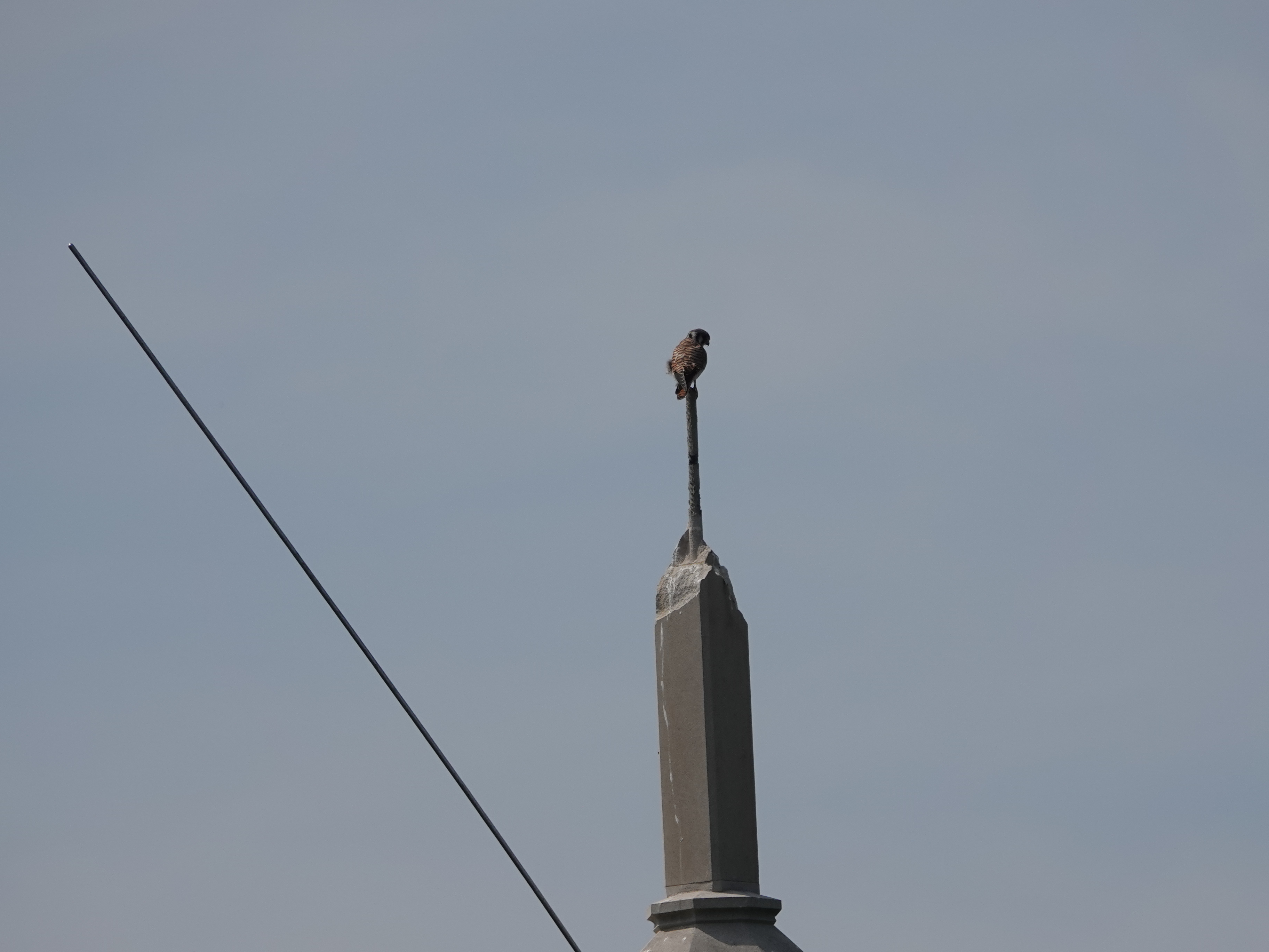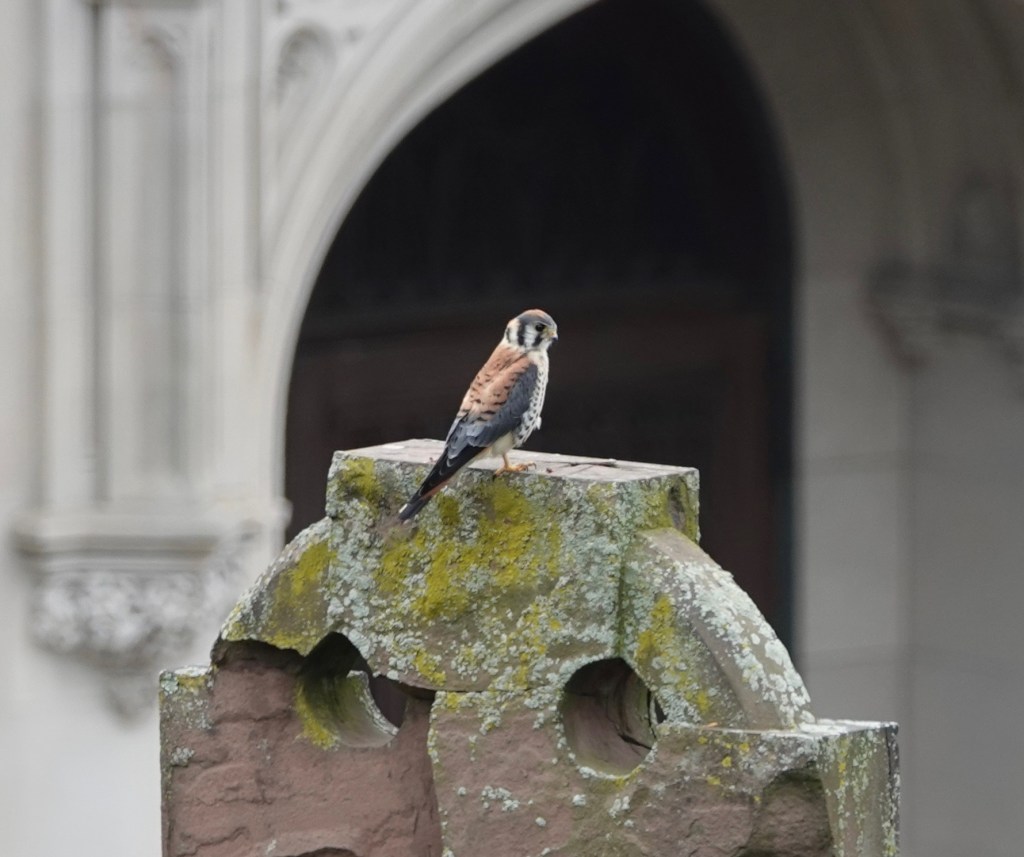 Scenes around the Old Chapel at Green-Wood. The Red-tailed Hawk and the male American Kestrel are perched at the same spot (on different days).