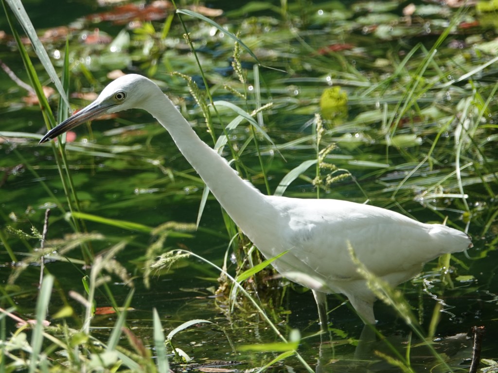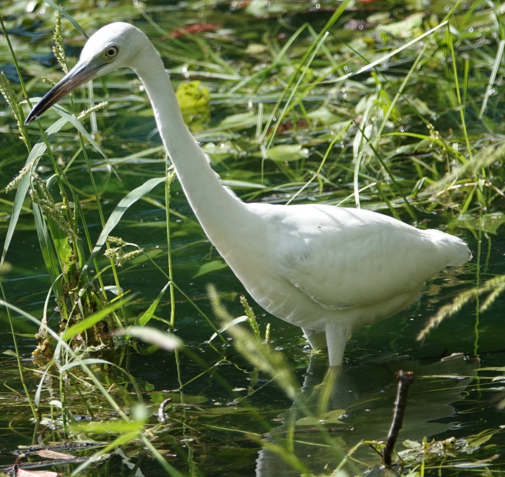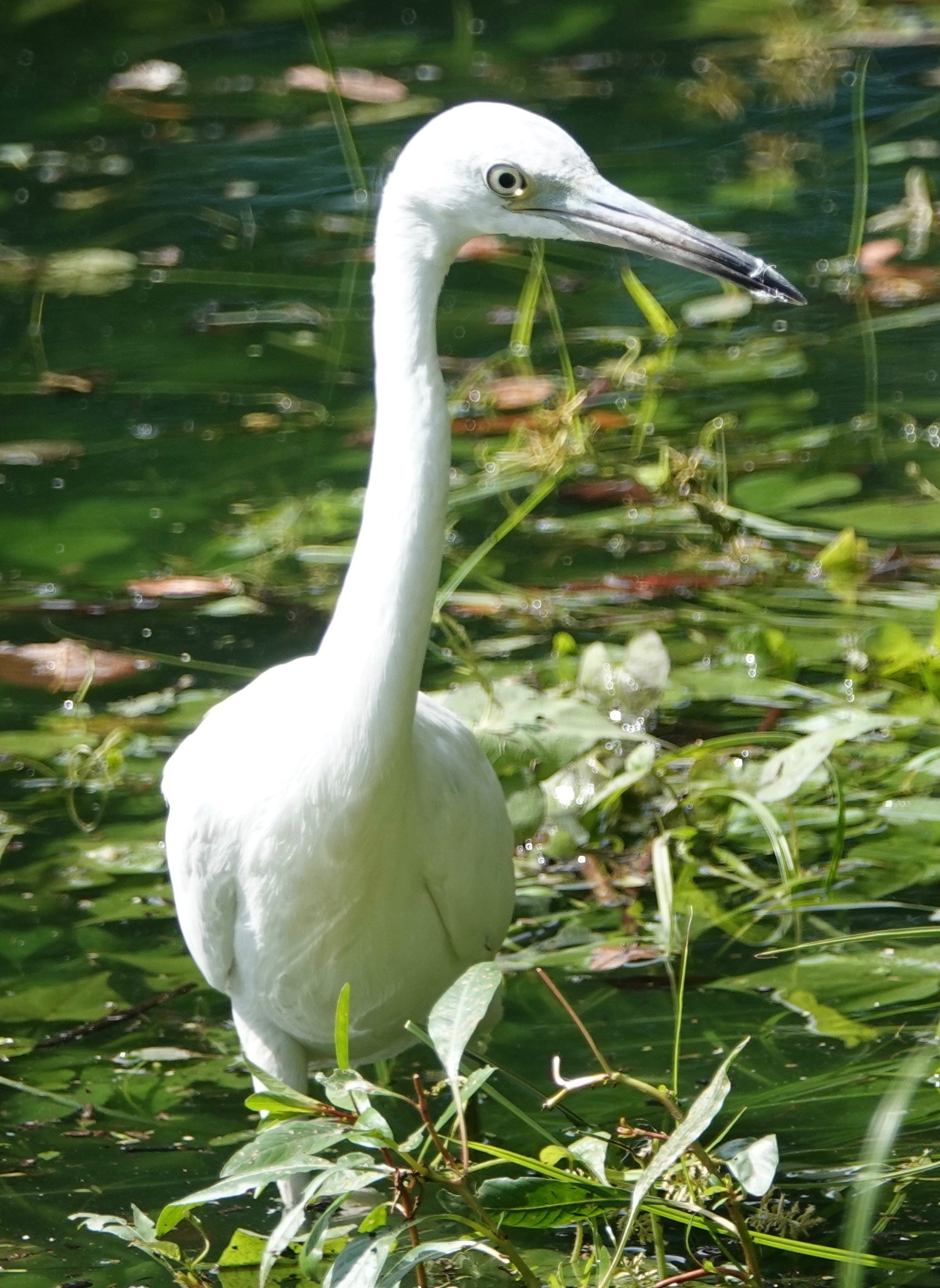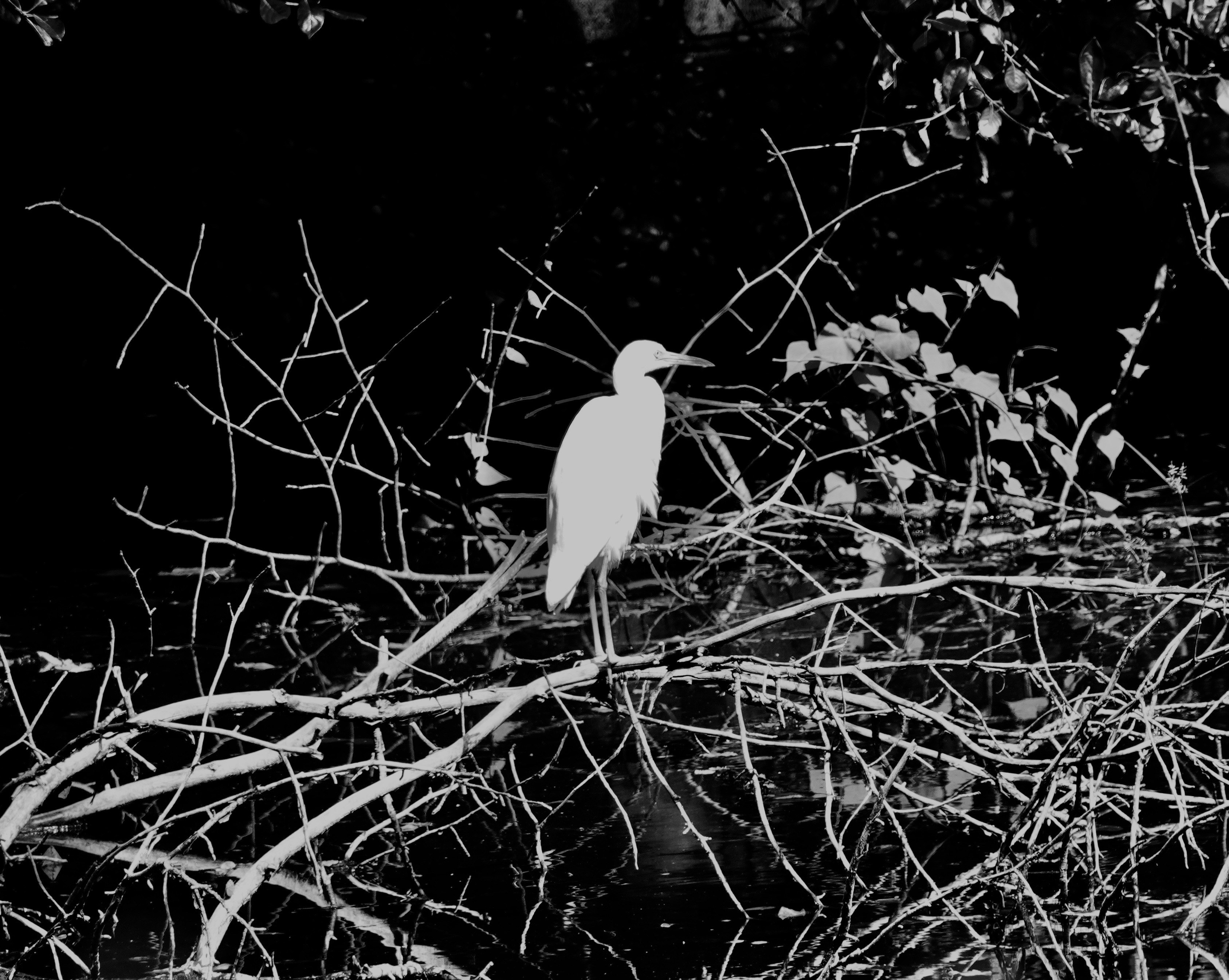 The Little Blue Heron/Egretta caerulea is white during its first months. The slaty blue starts coming in in the spring.