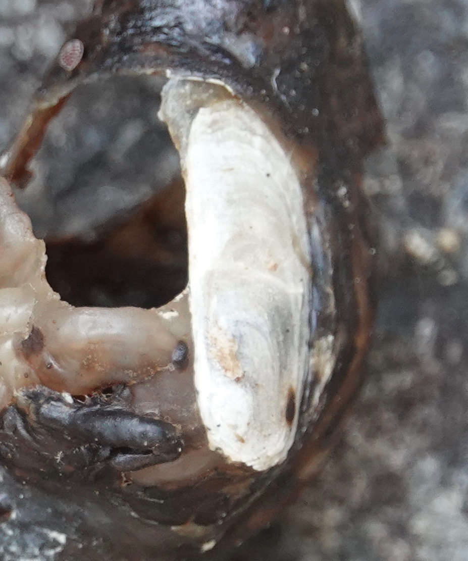 This decomposing slug shows off the calcareous, plate-like form, eroded out, as it were. These internal shells largely function as calcium storage for the animal.