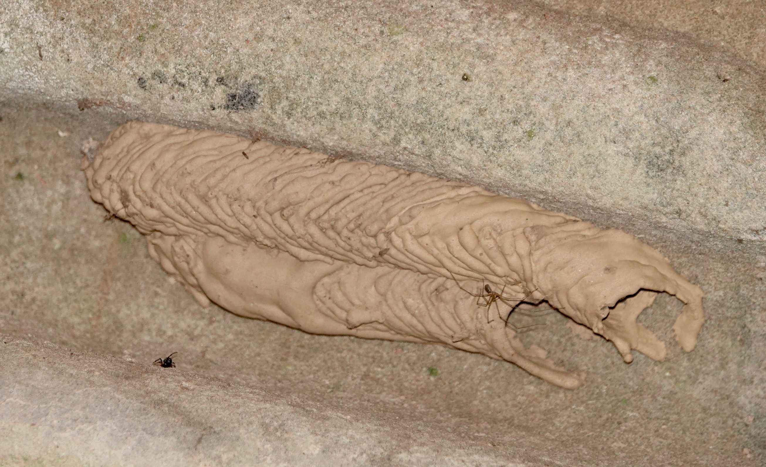 The female wasps build these long chambered tubes, stuffing them with spider prey for their young. Most are vertical, but there re some horizontal ones, too. They sometimes follow the topography of the terrain, as it were.