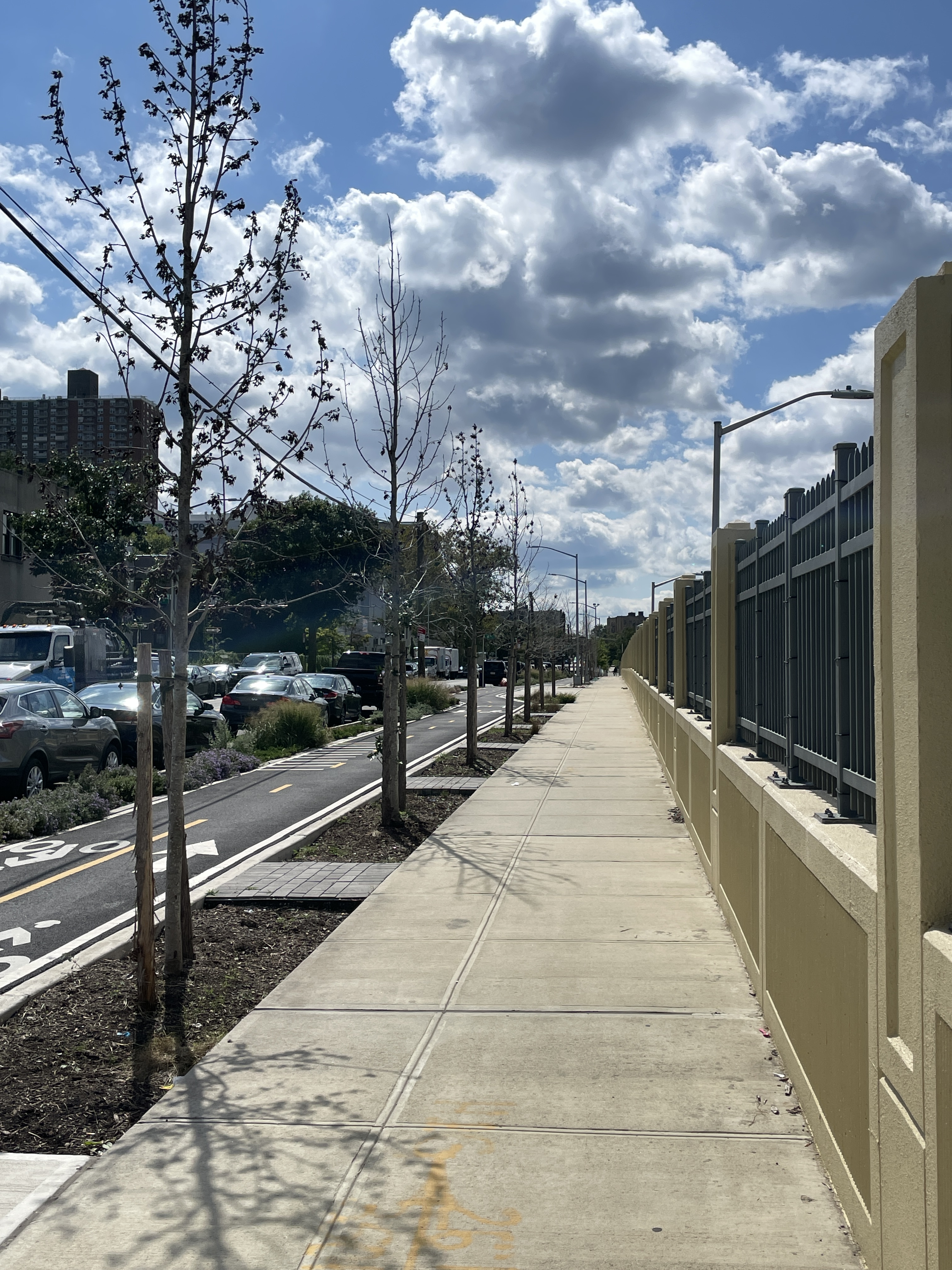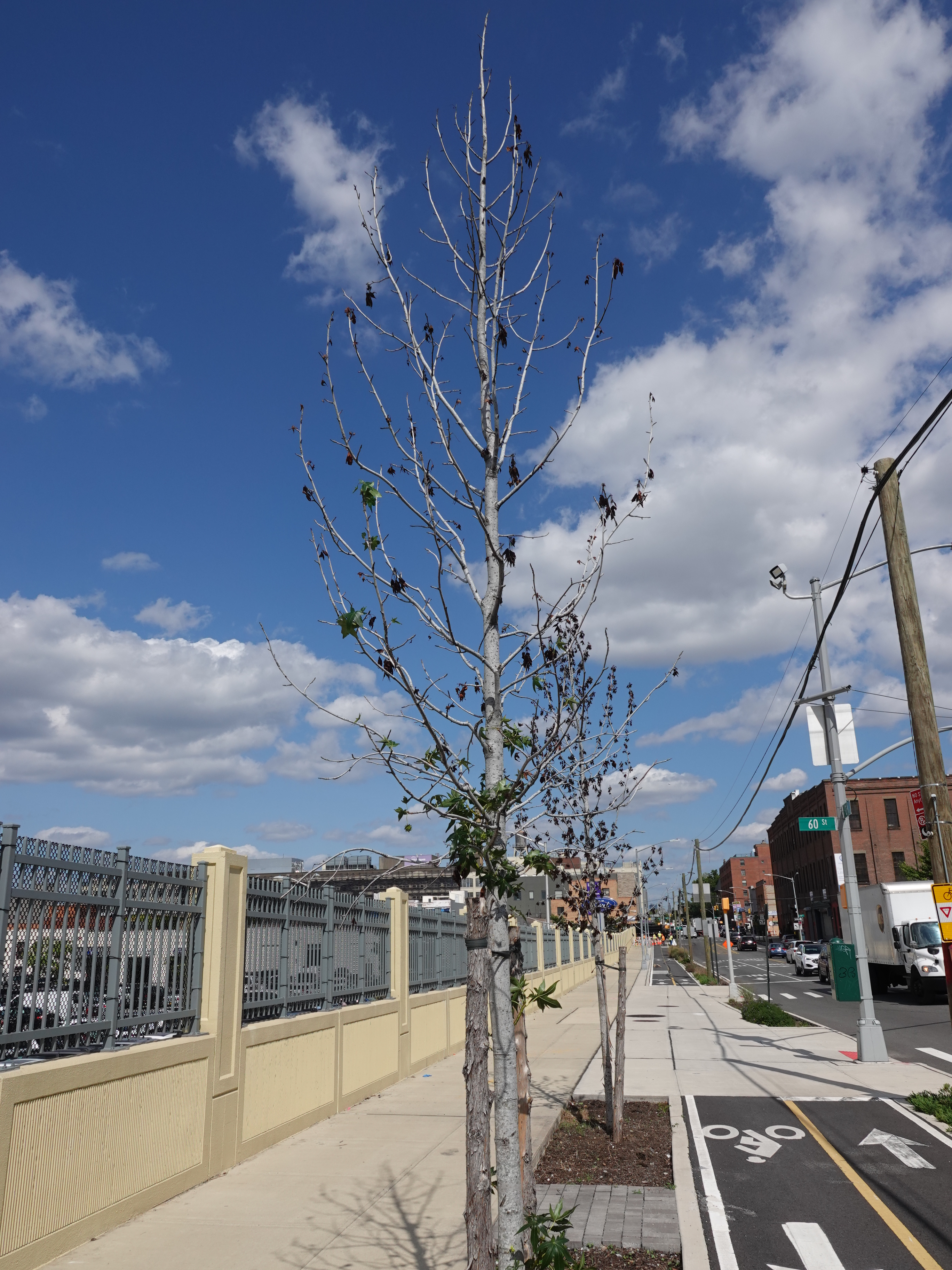 Twenty-four trees were put in this stretch of bike lane/sidewalk on 2nd Avenue next to the Brooklyn Army Terminal a couple of years ago. It’s been a slaughter: sixteen are dead.