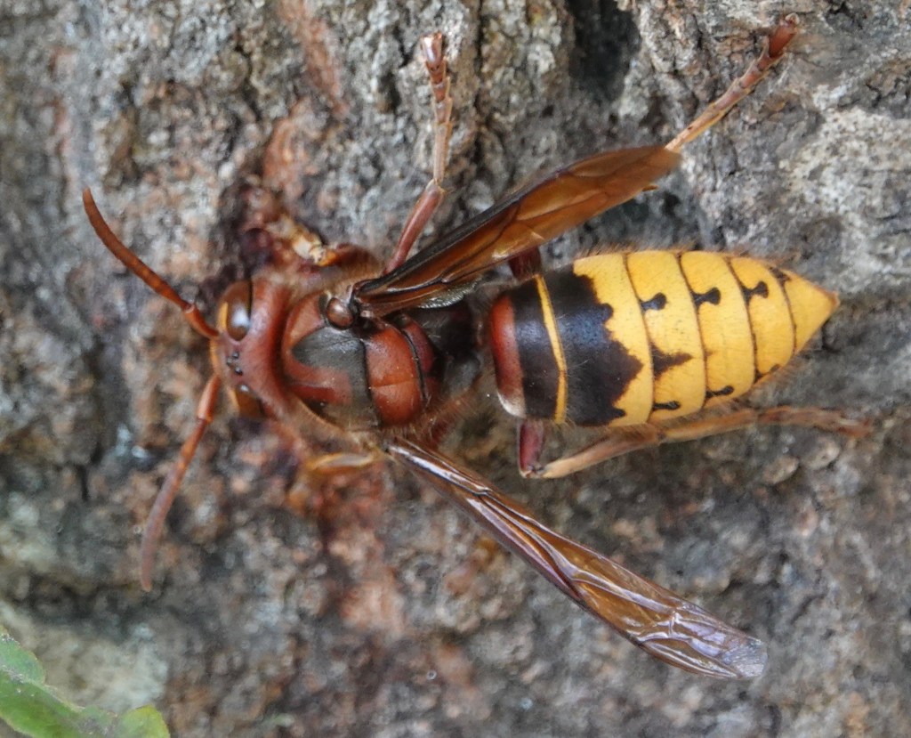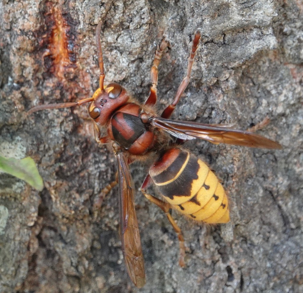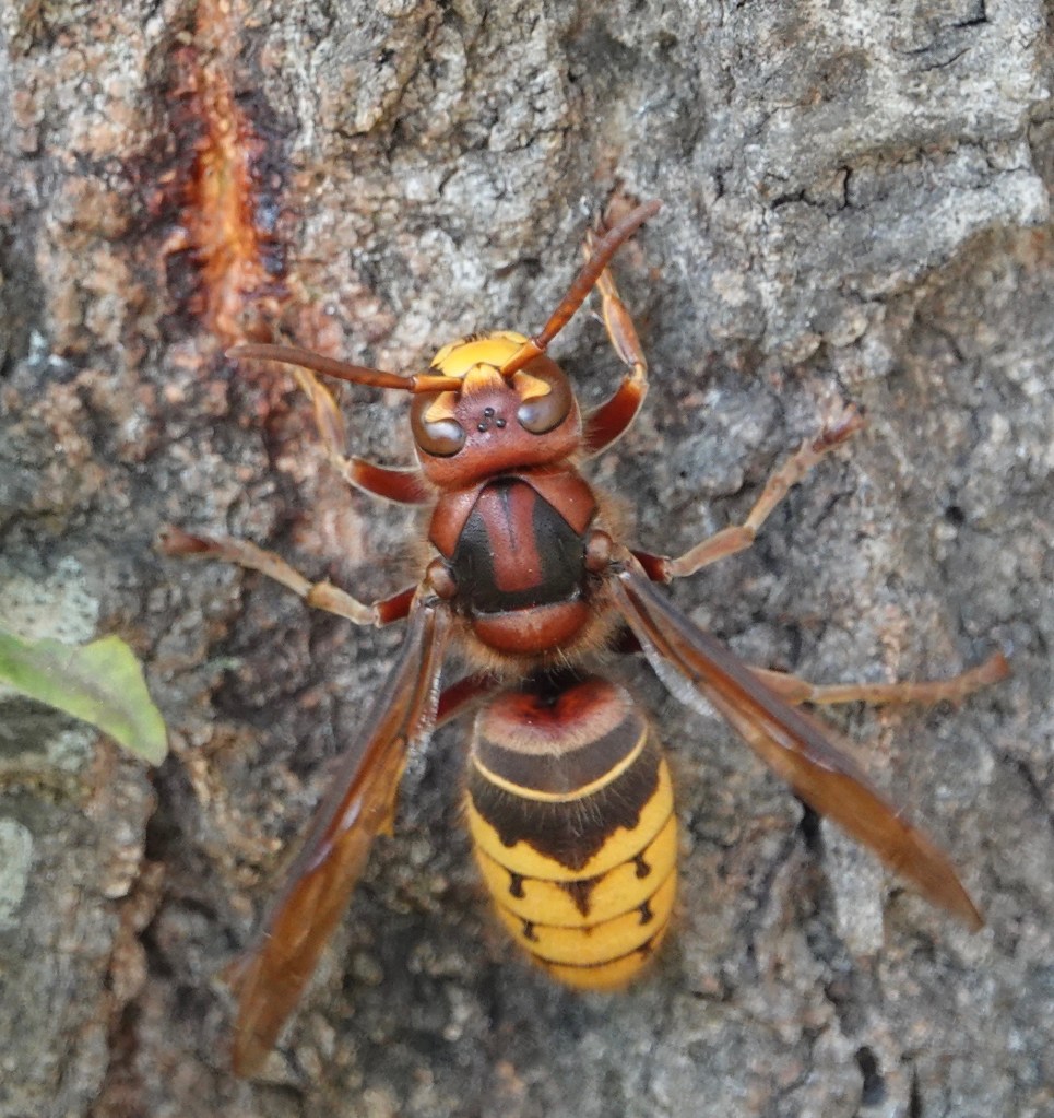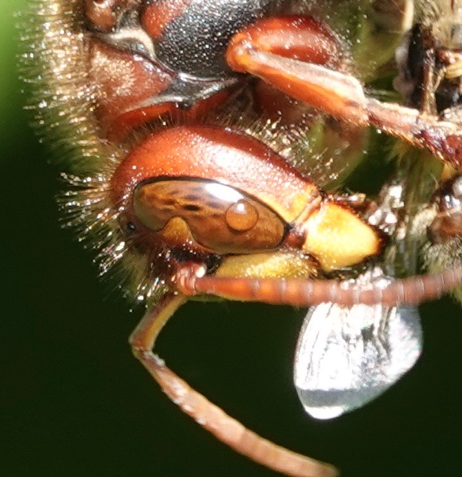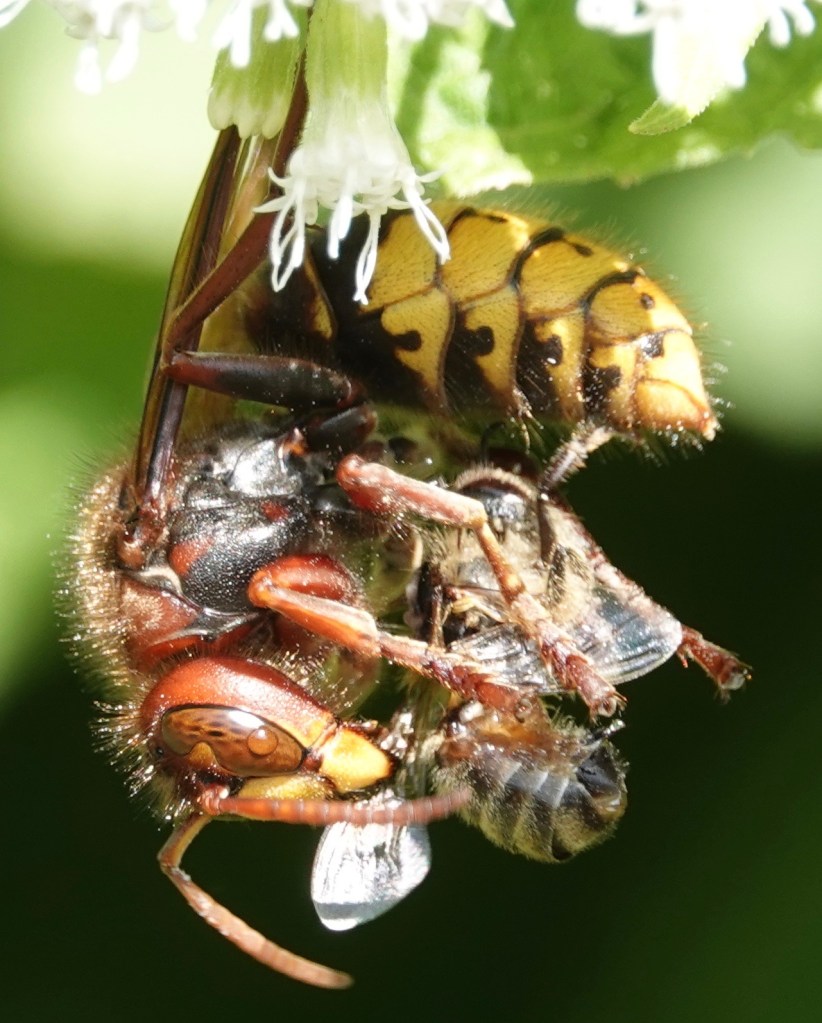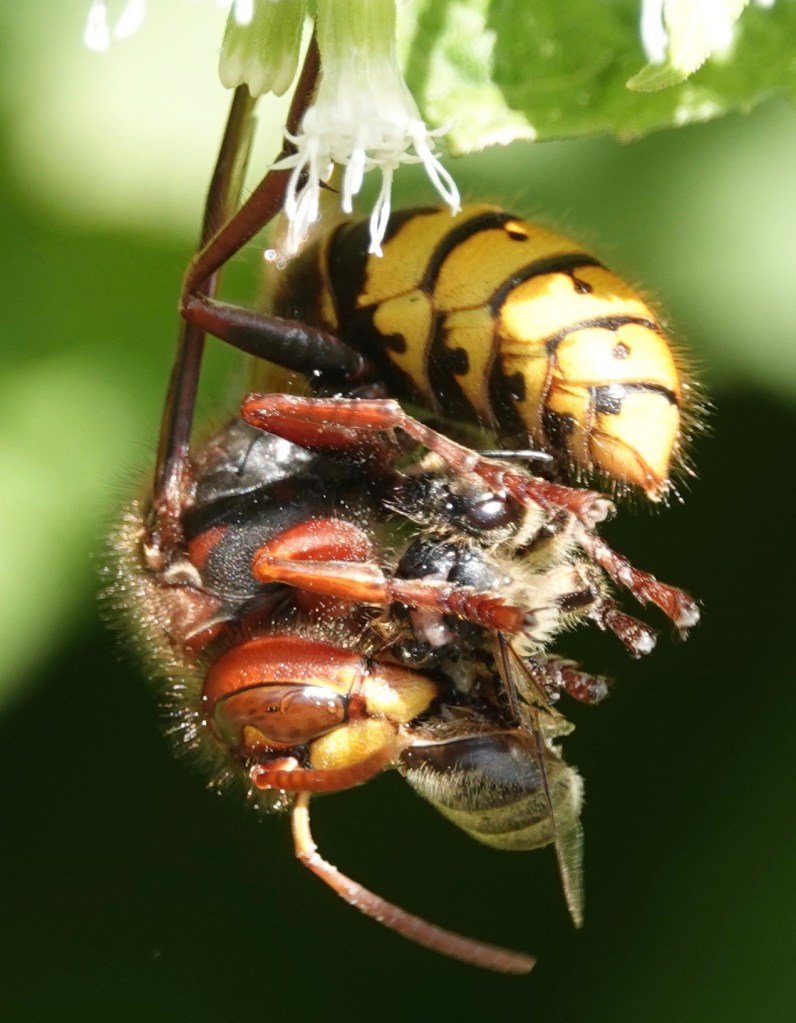 A European Hornet/Vespa crabro chomps up a bee. This is a true hornet, and an introduction to North America. It’s been around since the mid-1800s. These wasps are late season, meaning I’m still seeing them in October. (They come out at night, too, but I’m rarely out at night). I’ve been on the lookout for one of their tree-cavity nests for years now. (Only a couple of the nests have been documented in NYC on iNaturalist, although clearly the wasps are all over.)