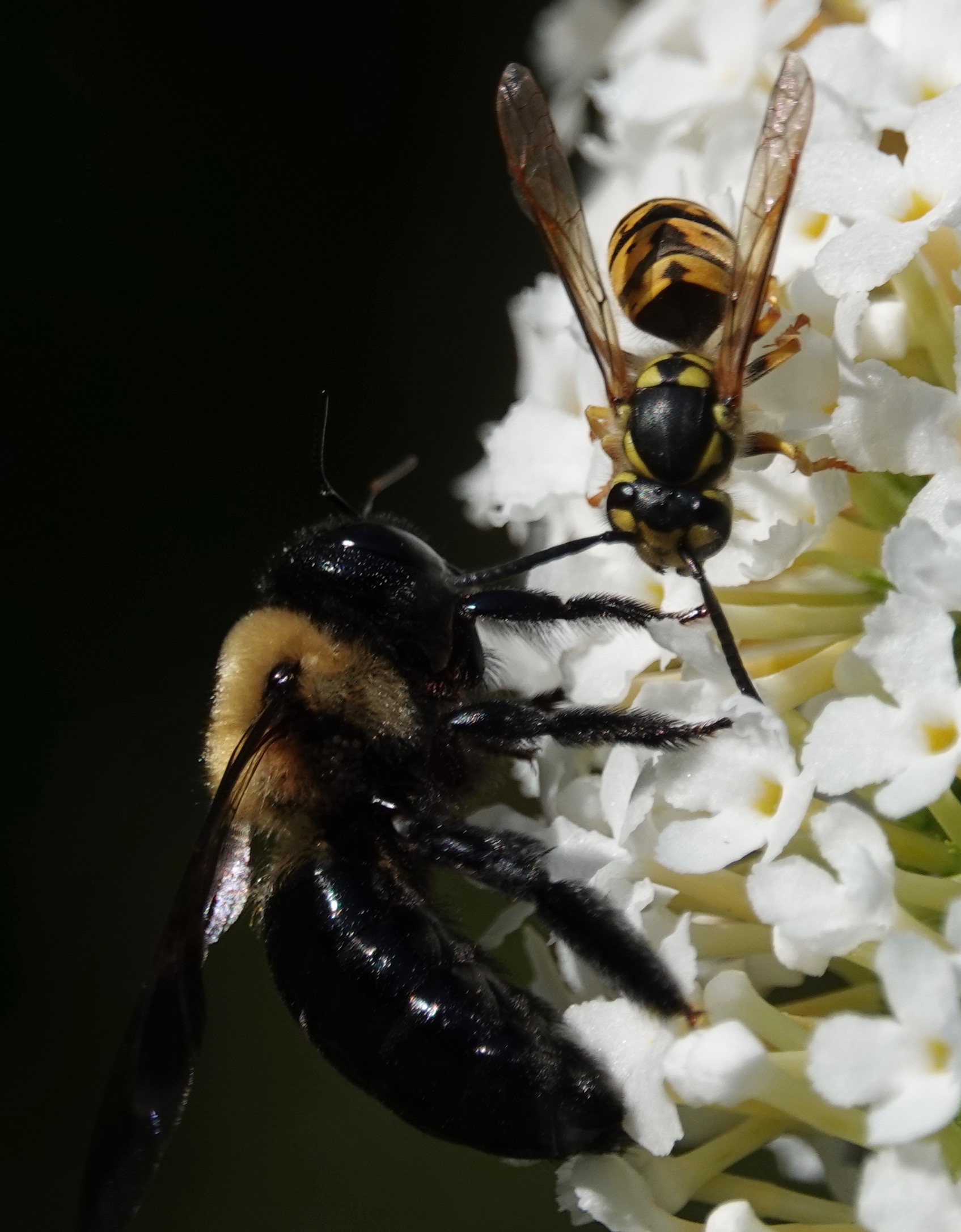 Back to the pace-setting Eastern Carpenter Bee, this time with a German Yellowjacket alongside.