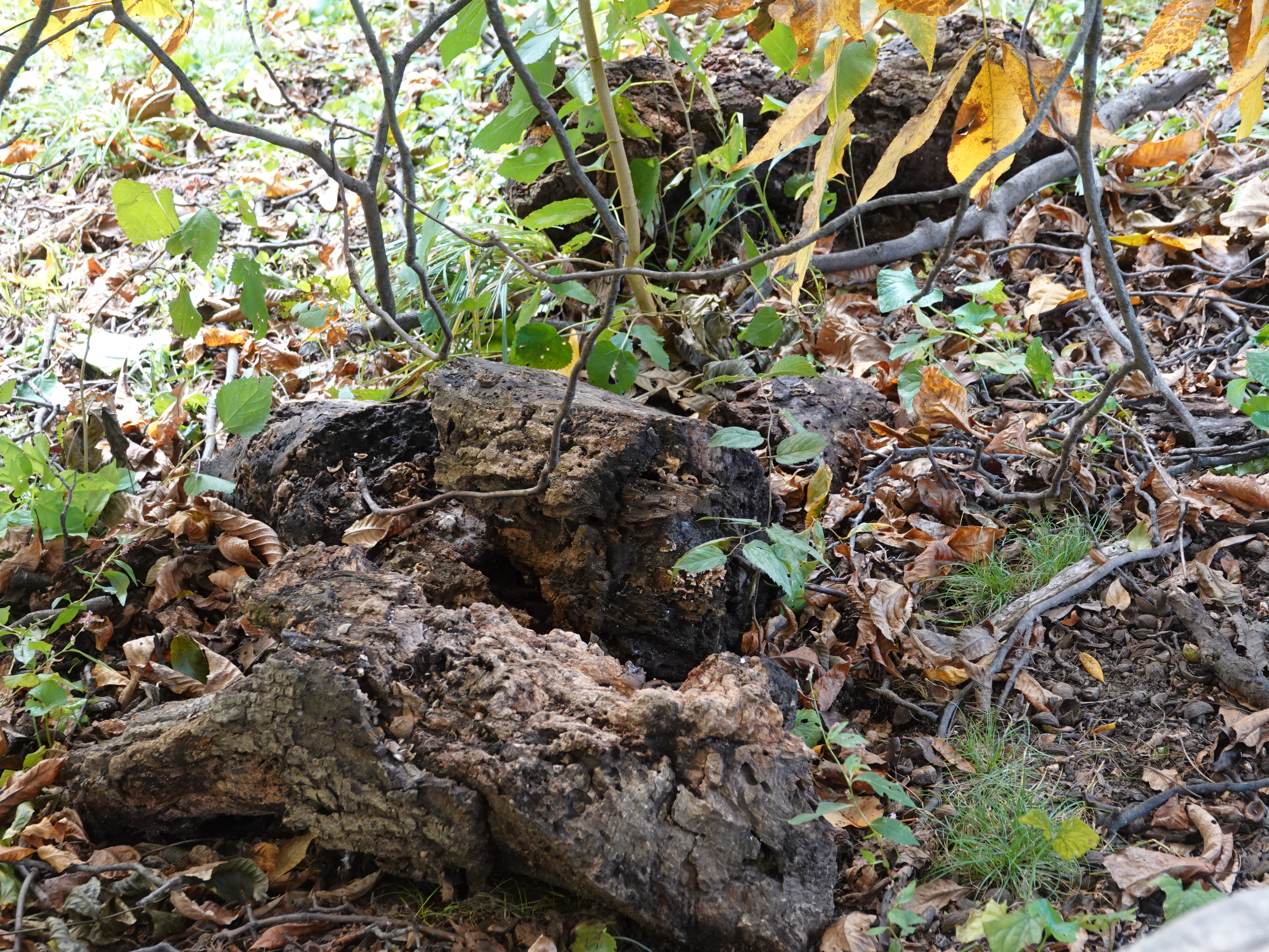 In March, 2022, I noticed some fallen Pignut/Carya glabra wood under a venerable tree. A rotted limb had fallen and broken into pieces. There was a little jewel in there. The other day I returned. The wood was still there. It’s a well-managed cemetery: they usually clear away such fallen wood and brush, but this is a bit tucked out of the way..