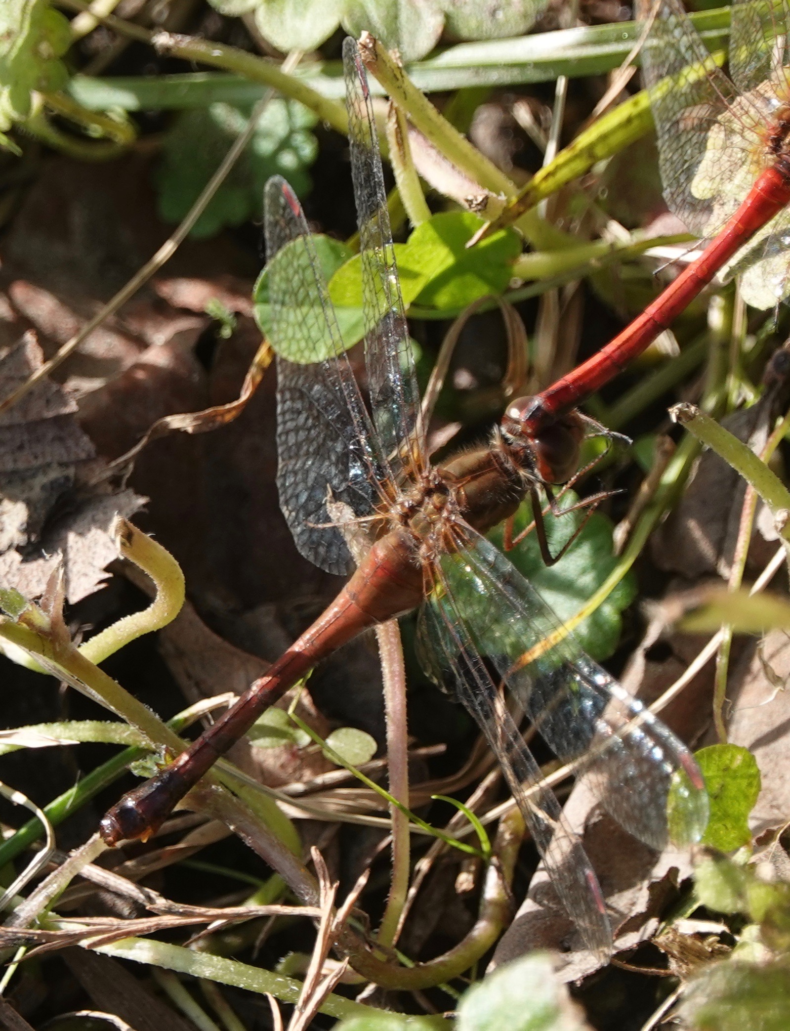 For instance, I rarely see female Autumn Meadowhawks/Sympetrum vicinum on their own. They’re obviously out there, but I generally only see them when they’re mating. Here a pair form the Odonata mating wheel: the male grasps the female behind her head with the appendages at the end of his abdomen; she bends her abdomen tip forward to his secondary genitalia between his second and third abdomen segments. “Secondary” because sperm is produced at the end of the abdomen; the male transfers this sperm to his accessory genitalia near the thorax, where the female can access it while he holds her.