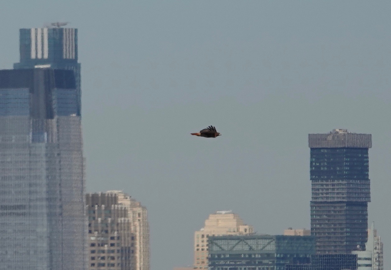 From the Brooklyn Raptor Observatory, also known as our apartment, the car service antenna at 40th and 5th is a landmark. American Kestrels perch atop one of the two parts regularly. Merlins, Red-tailed Hawks, Coopers Hawks, and Peregrines have also been known to perch on it, the larger birds preferring the horizontal superstructure (unseen here). Above, a Red-tail being harried by a crow passes it by.