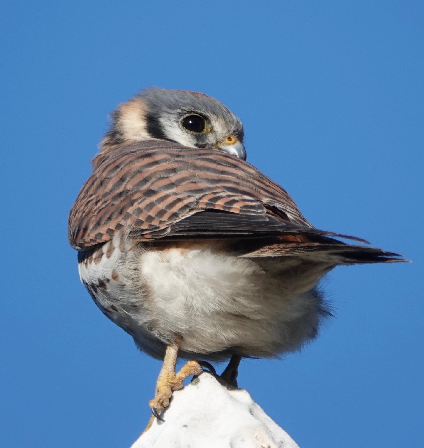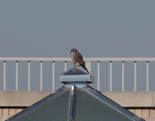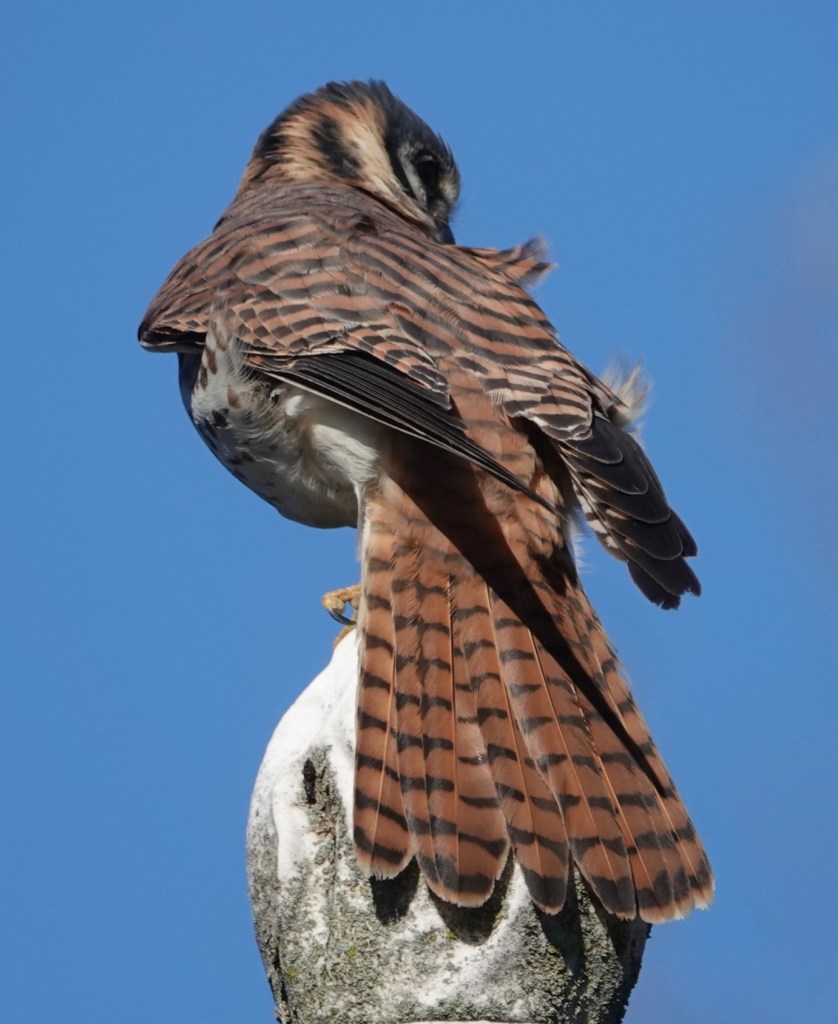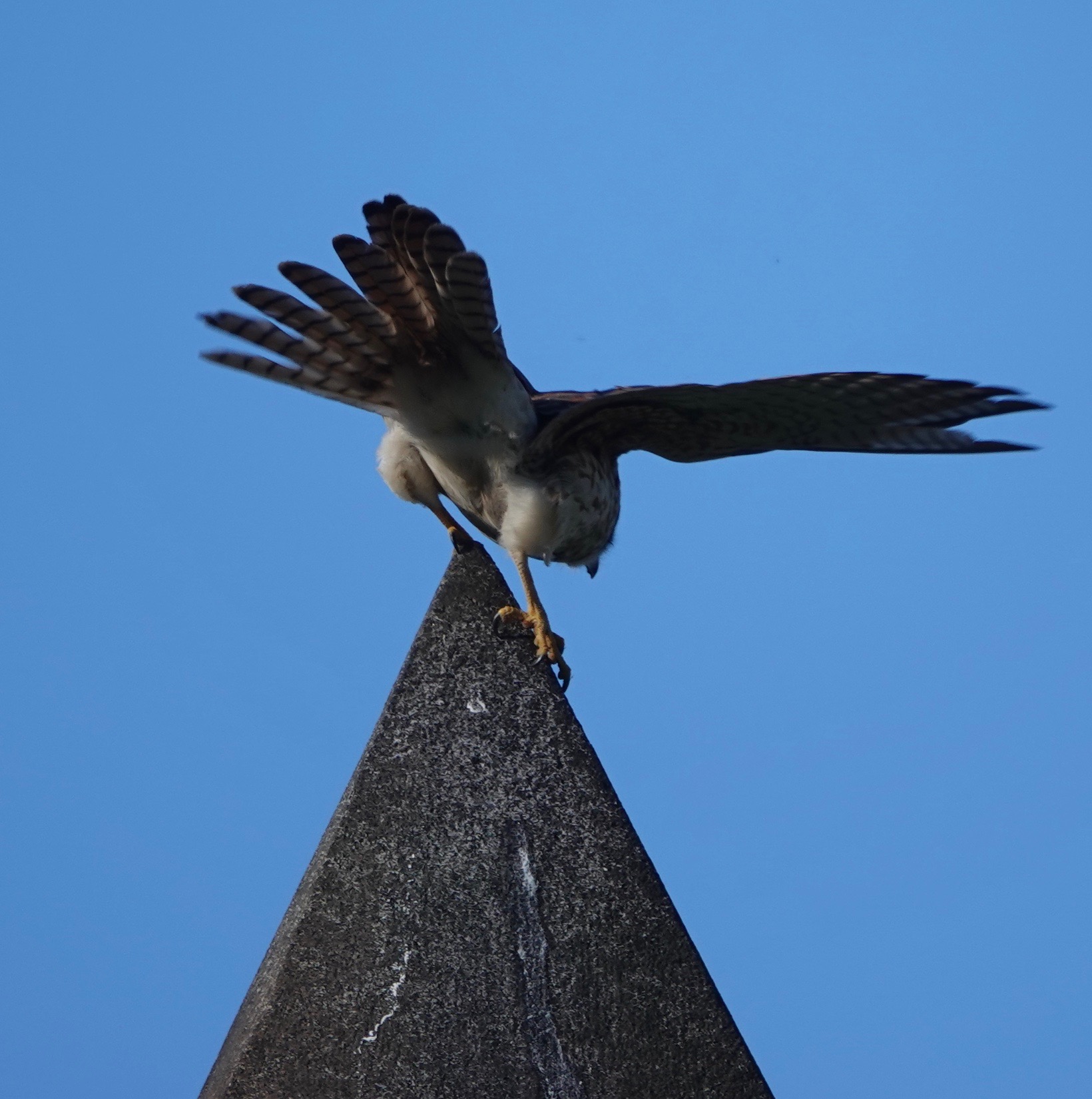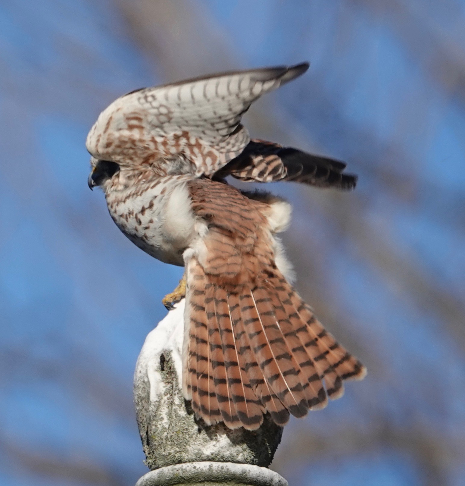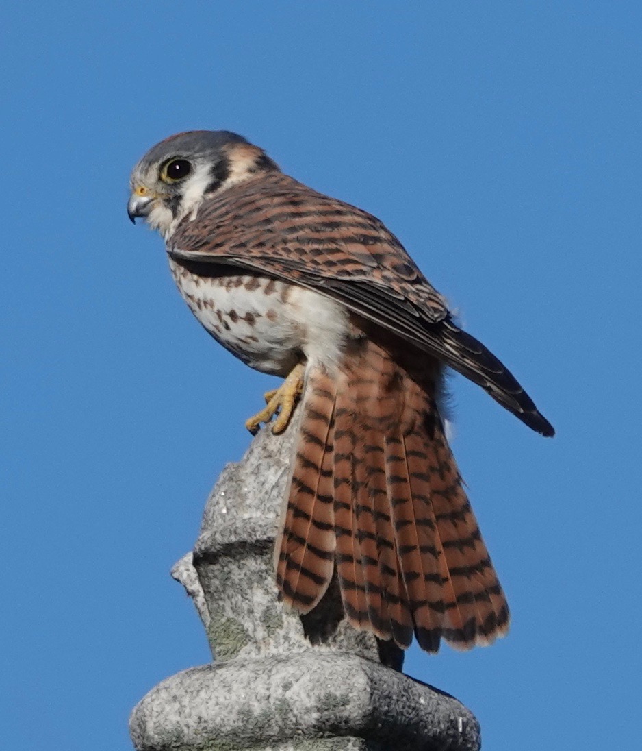 A windy day. This female American Kestrel was flying between funeral monuments and occasionally having difficulty with the wind.