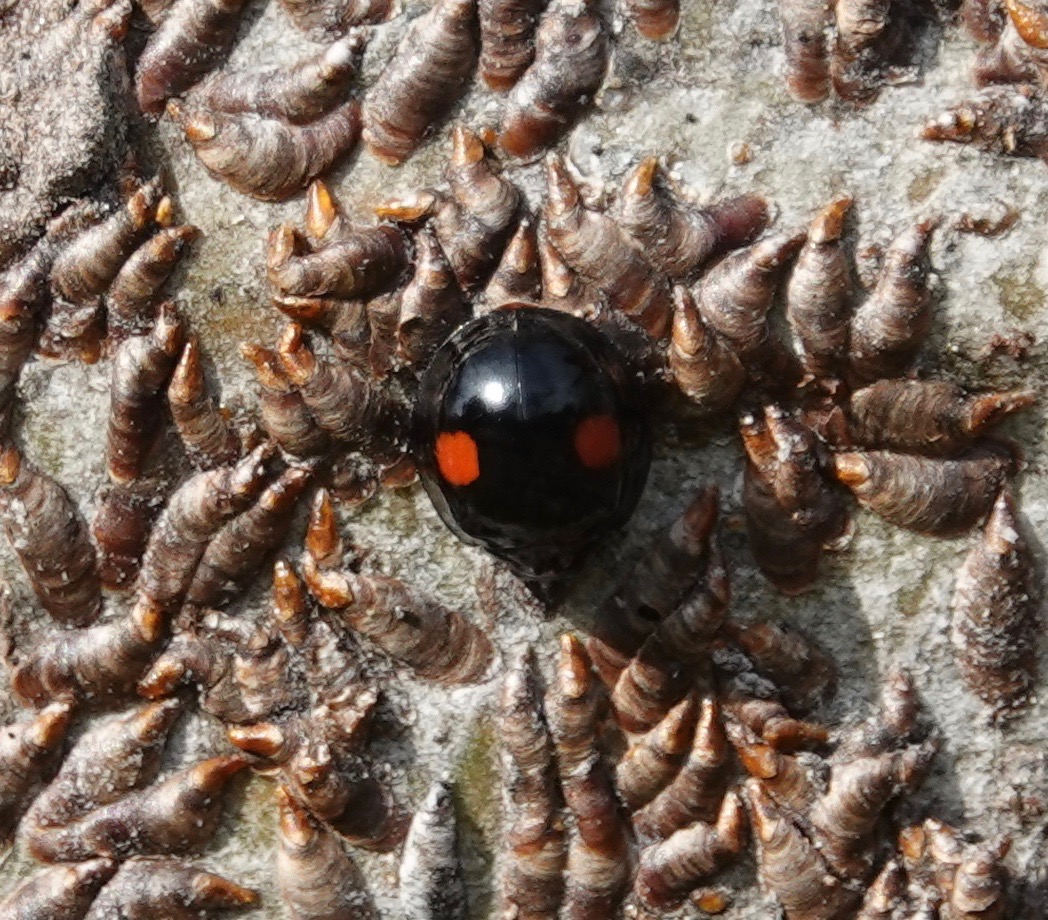 I added 211 new species to my iNaturalist tally this year, even if I can’t be quite sure of species-level ID in every case. Above are two of them: a scale insect that may be Oystershell Scale/Lepidosaphes ulmi and one of their predators, a Chilocorus genus twice-stabbed lady beetle.