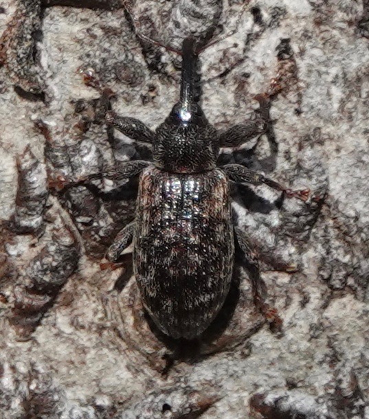 A 5mm long (not including snout…) weevil heading up the bole. The trees afflicted with all this scale are Trembling Aspen/Populus tremuloides, which was a clue to my ID. I believe this is one of the Willow Weevils, genus Dorytomus, some of whom are known to feed on Populus catkins.