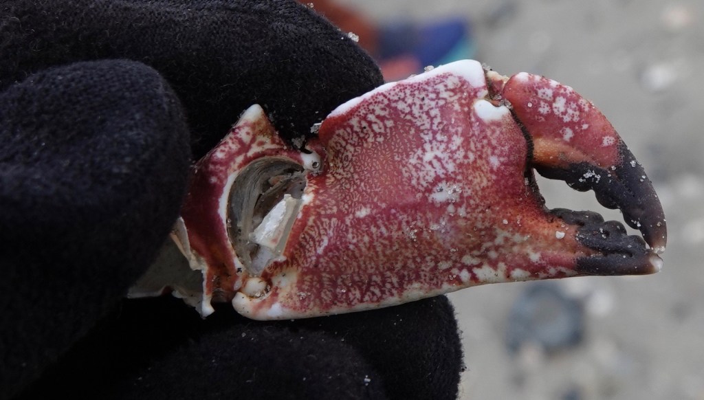 Washed ashore at Riis Beach: what I think is a Jonah Crab/Cancer borealis claw. About a week earlier, some very large waves were recorded in nearby NJ, so the storm must have really stirred up the bottom.