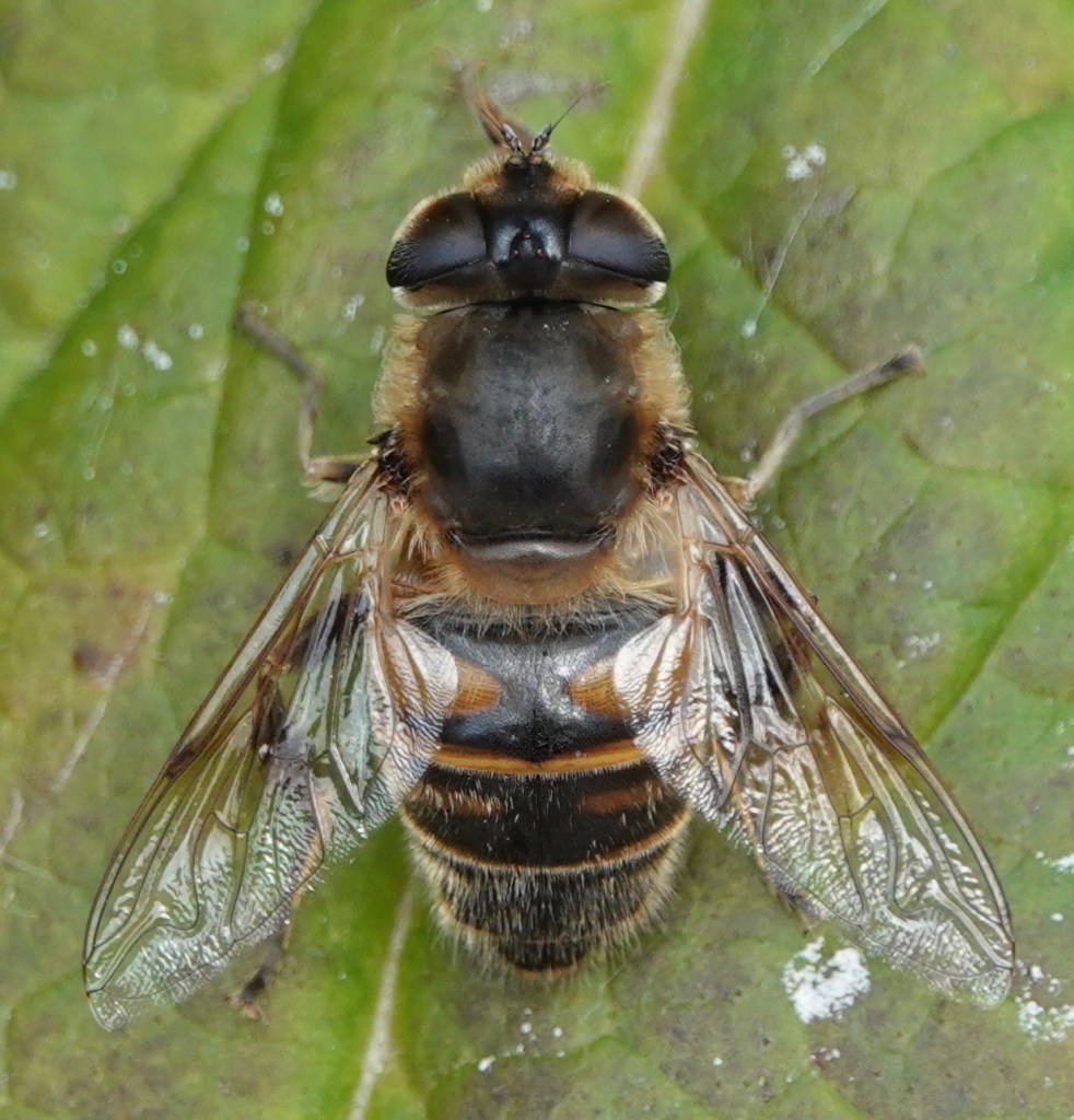 Late December temperatures in the mid-50s F add a Common Drone Fly/Eristalis tenax to the very limited mix of active insects.