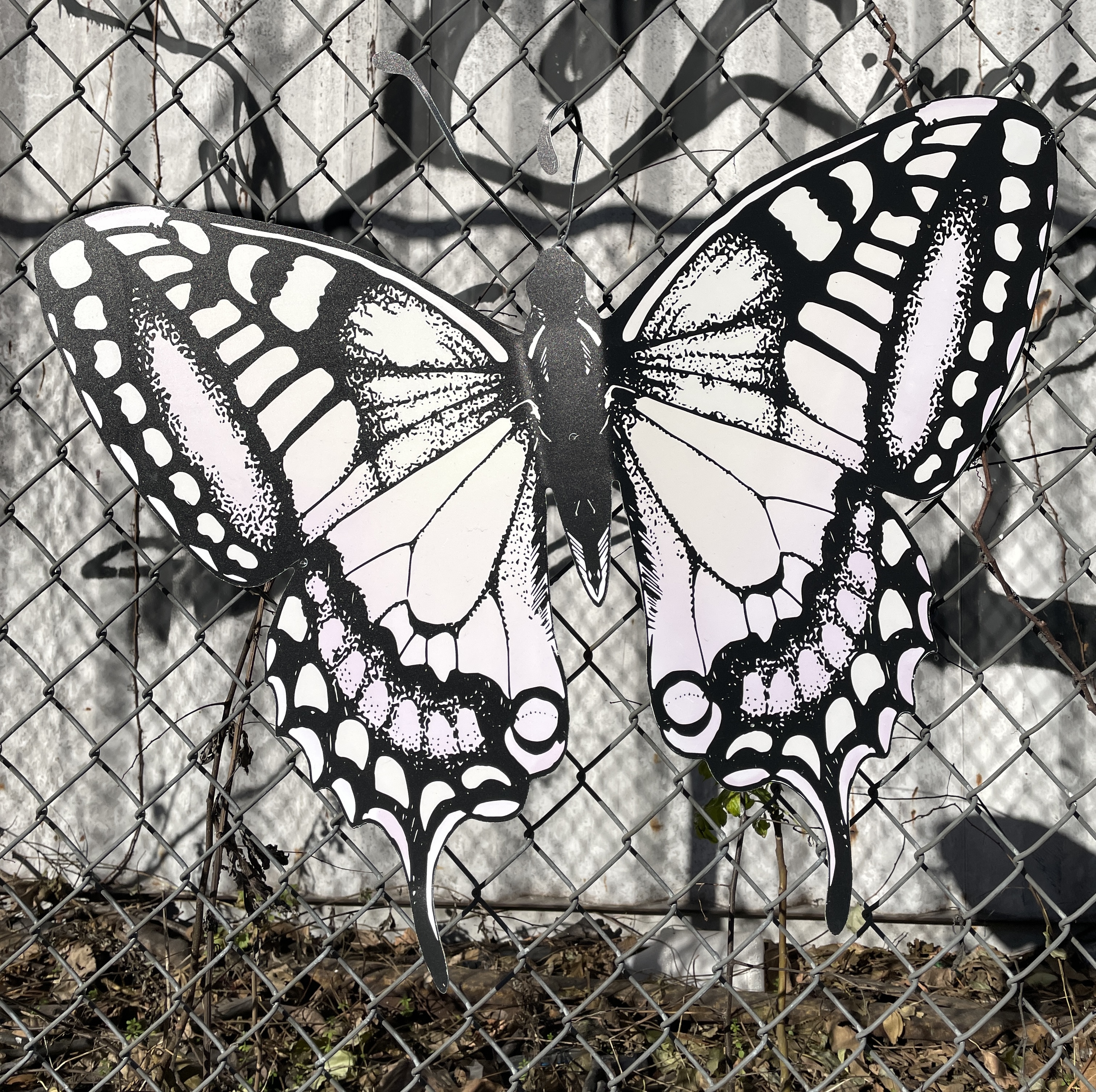 In metal, etc., attached to fence by antenna. Artist unknown. (Typing “metal butterfly art” into ye olde search engine resulted in some gawd-awful stuff, but I like this.)