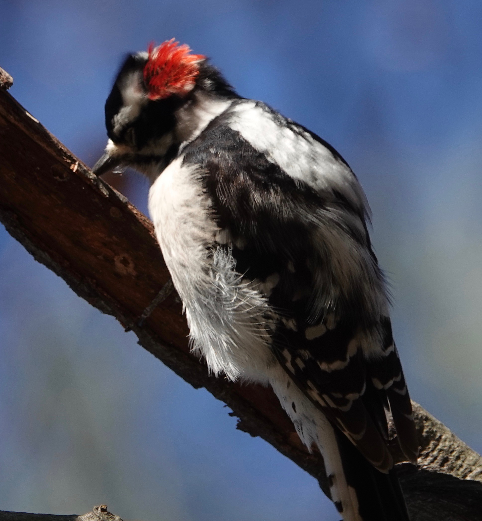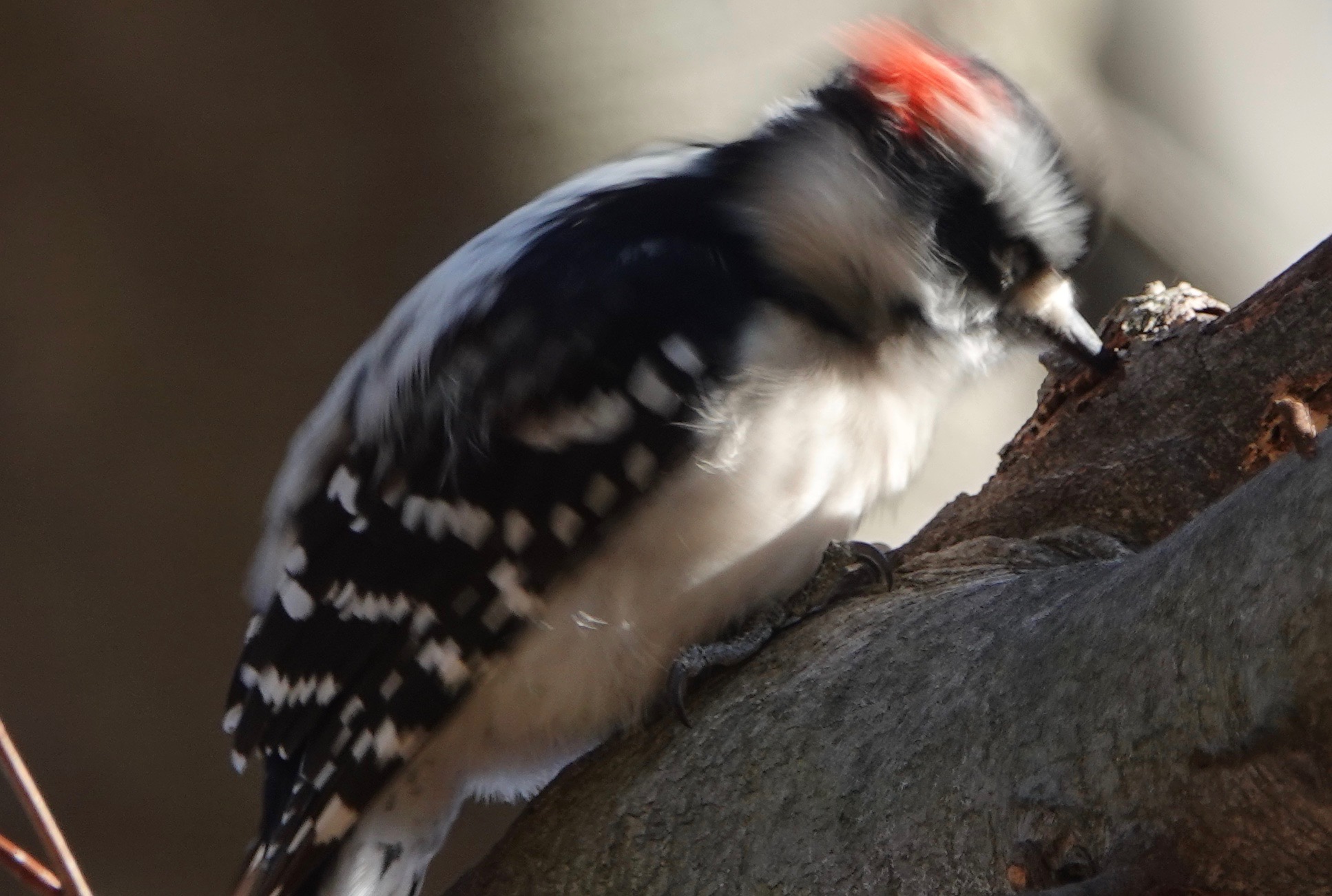 On a recent midday walk in Green-Wood I came across a Downy Woodpecker/Dryobates pubescens battering away at a dead looking branch of Beech.