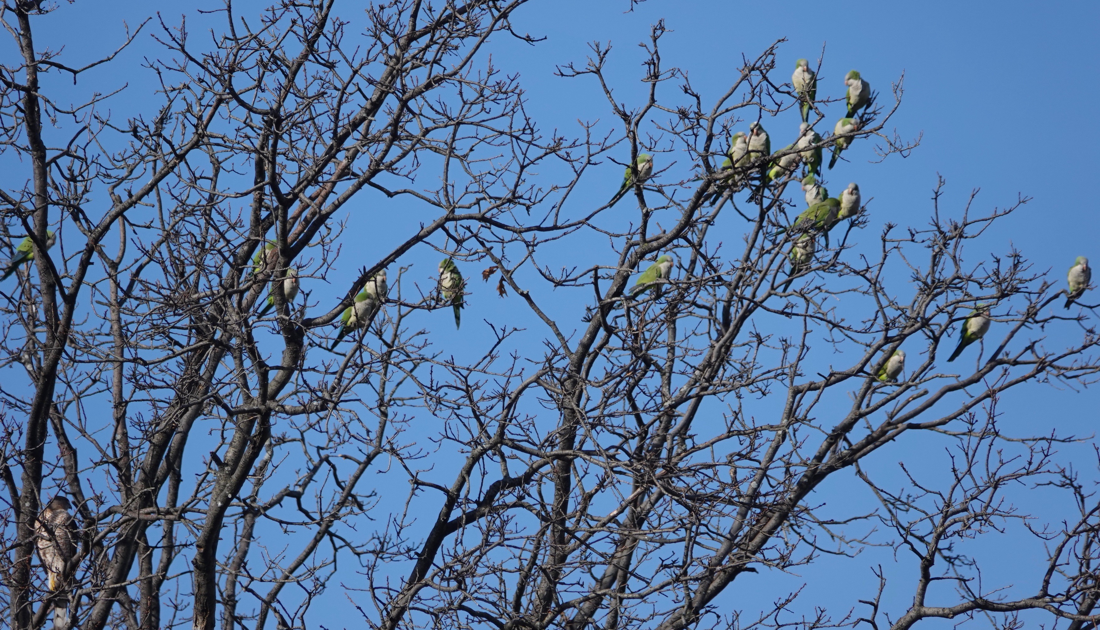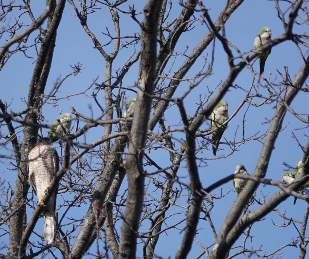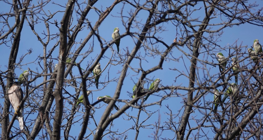 The Cooper’s pictured with yesterday’s feisty House Finch had already put up with a reception committee of Monk Parakeets: