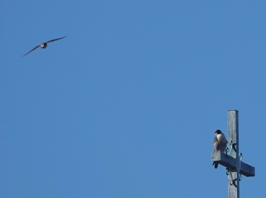 An American Kestrel flying by the Peregrine.