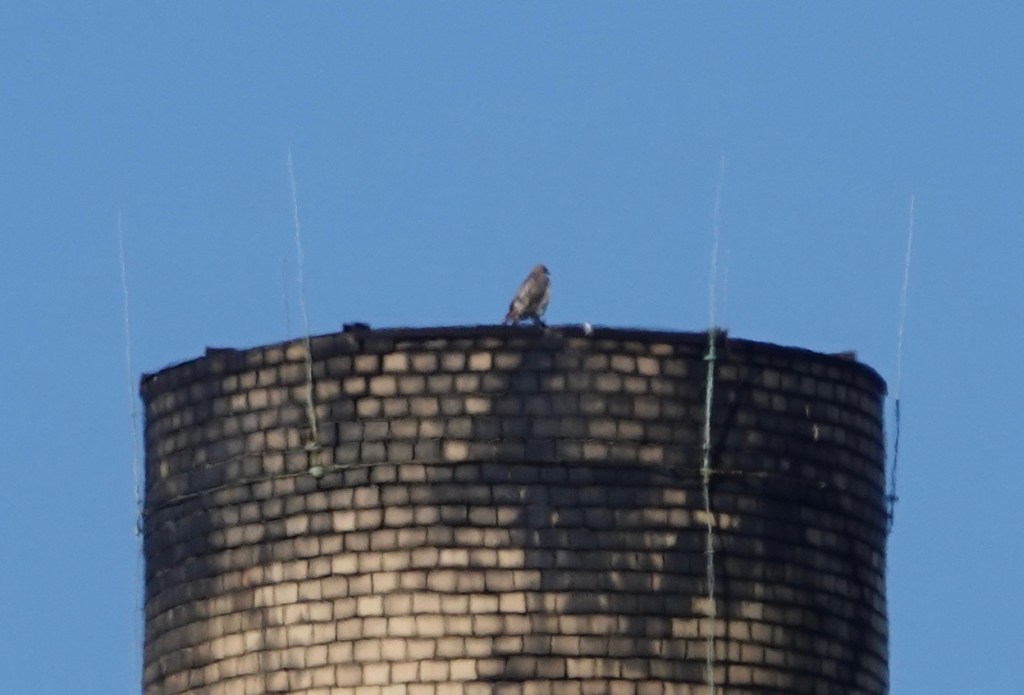 Distantly, a Red-tail atop the IC smokestack. Once home again, during the afternoon I spotted a male American Kestrel on the car service antenna a block away,