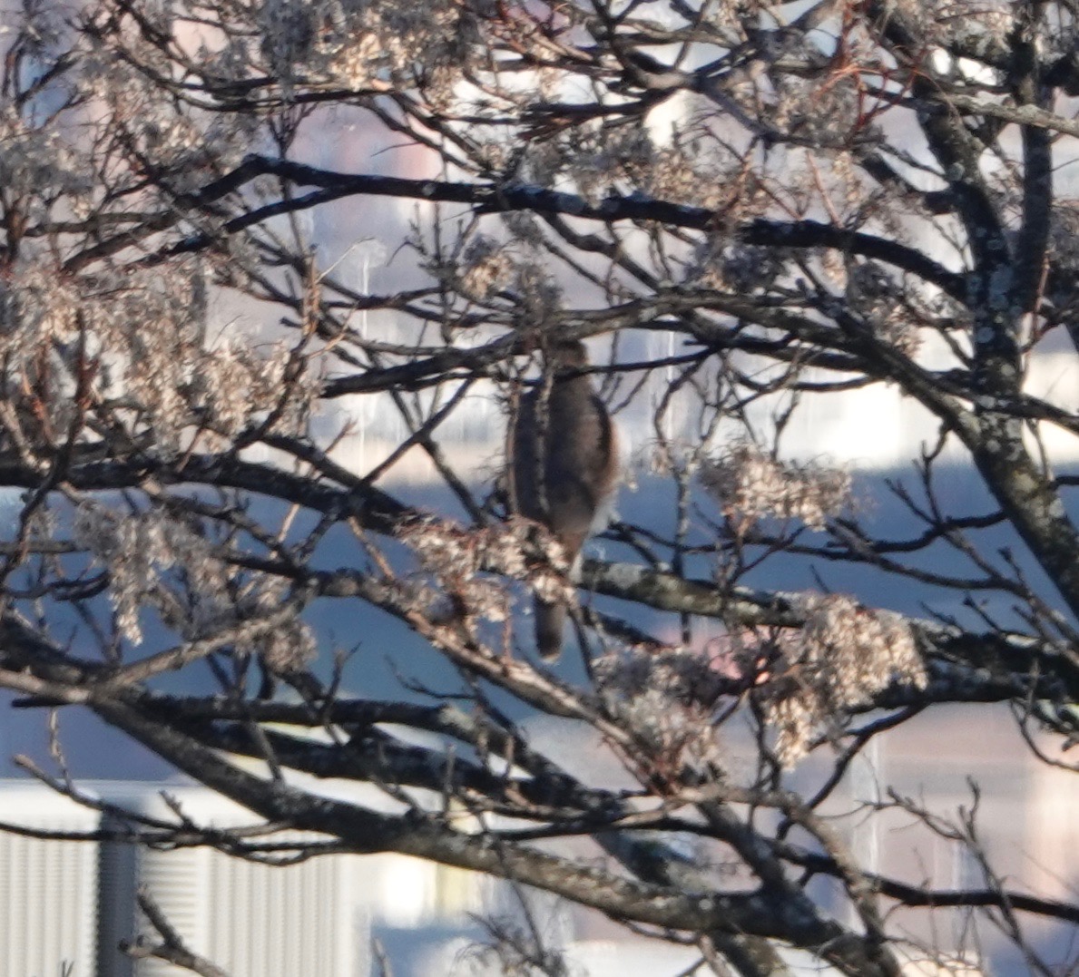 Distantly, a Red-tail atop the IC smokestack. Once home again, during the afternoon I spotted a male American Kestrel on the car service antenna a block away,