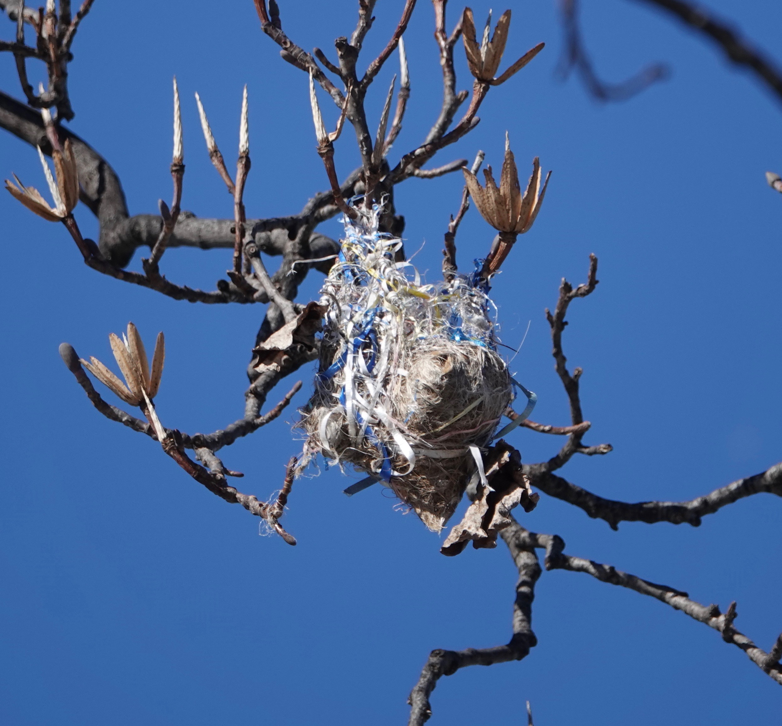 These Baltimore Oriole nests seem to survive due to their incorporation of human-made materials.