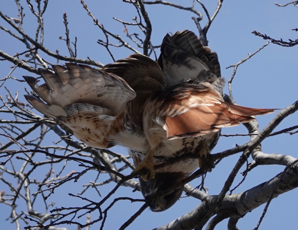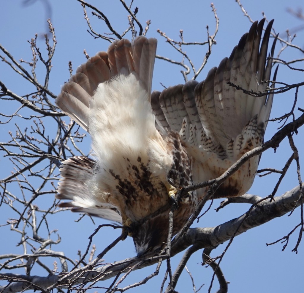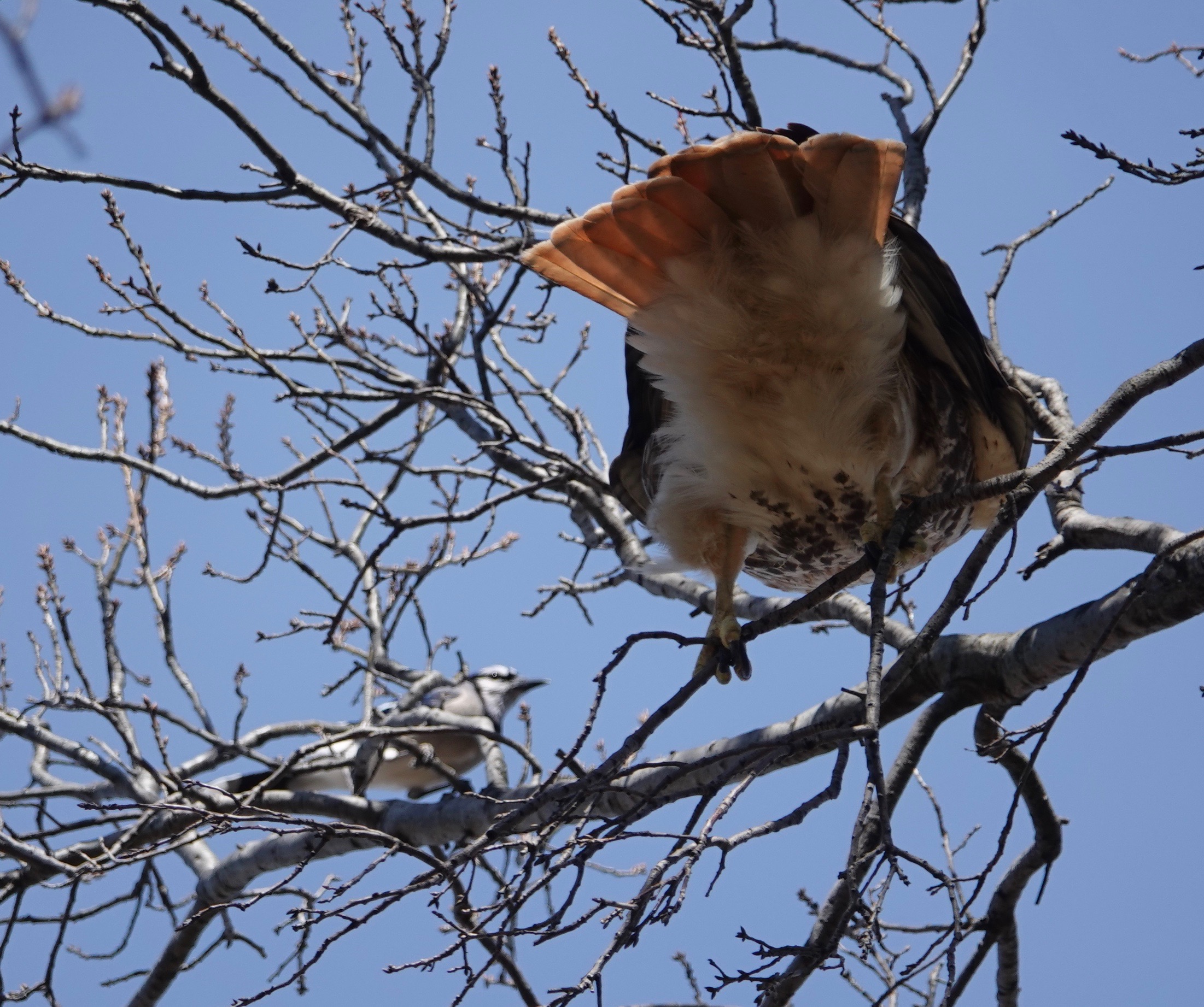 This heavily-marked Red-tailed Hawk was trying to break off a branch for nest material as a lone Blue Jay registered a complaint.