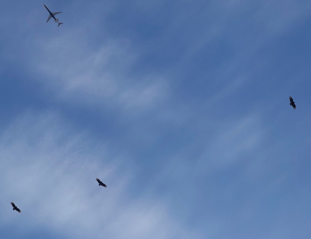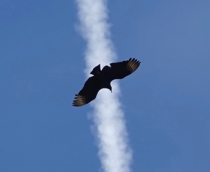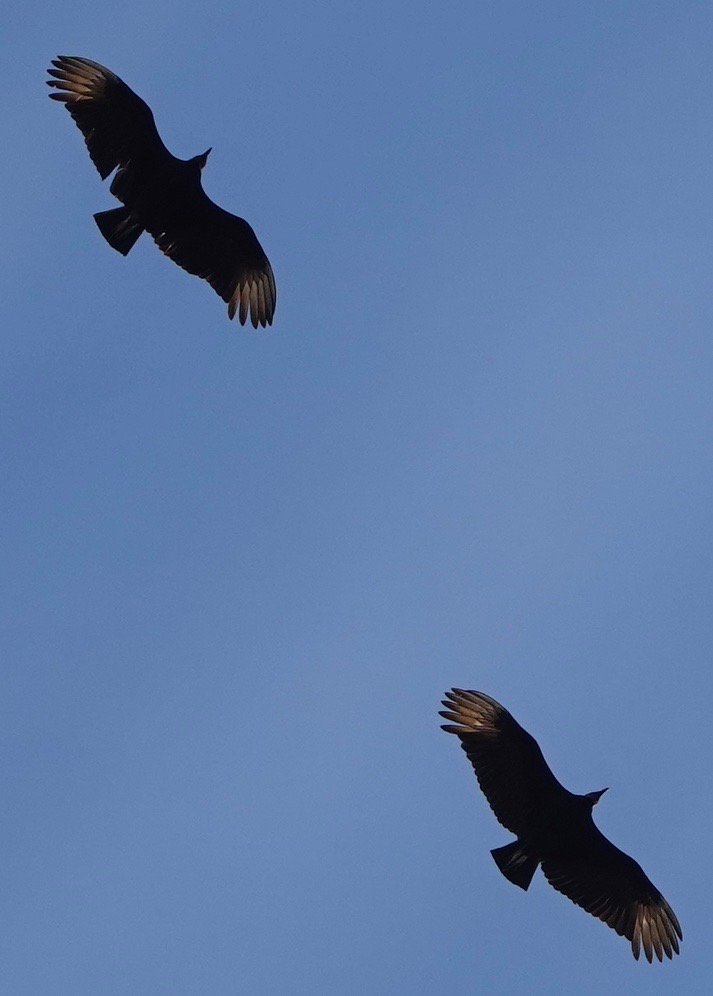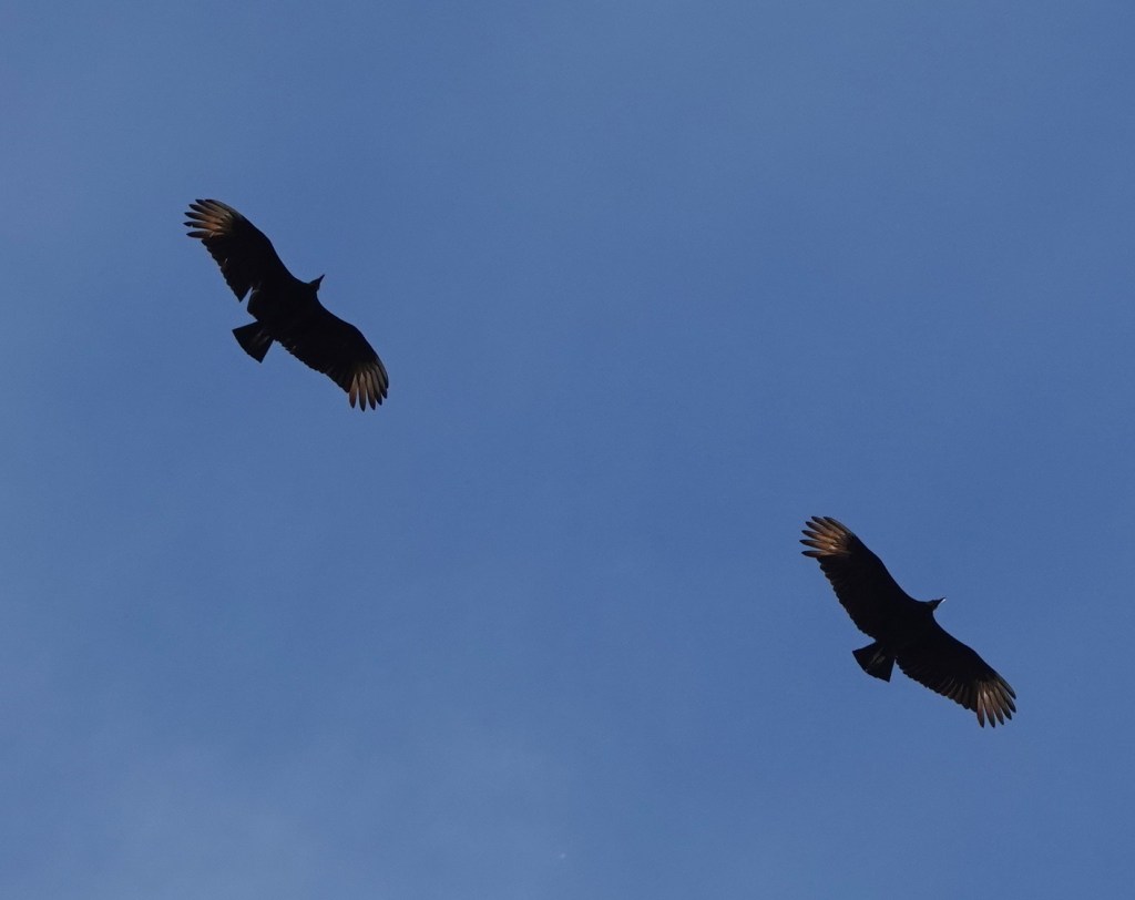 A trio of Black Vultures passing overhead. Three’s a lot for these parts, where Turkey Vultures predominate.