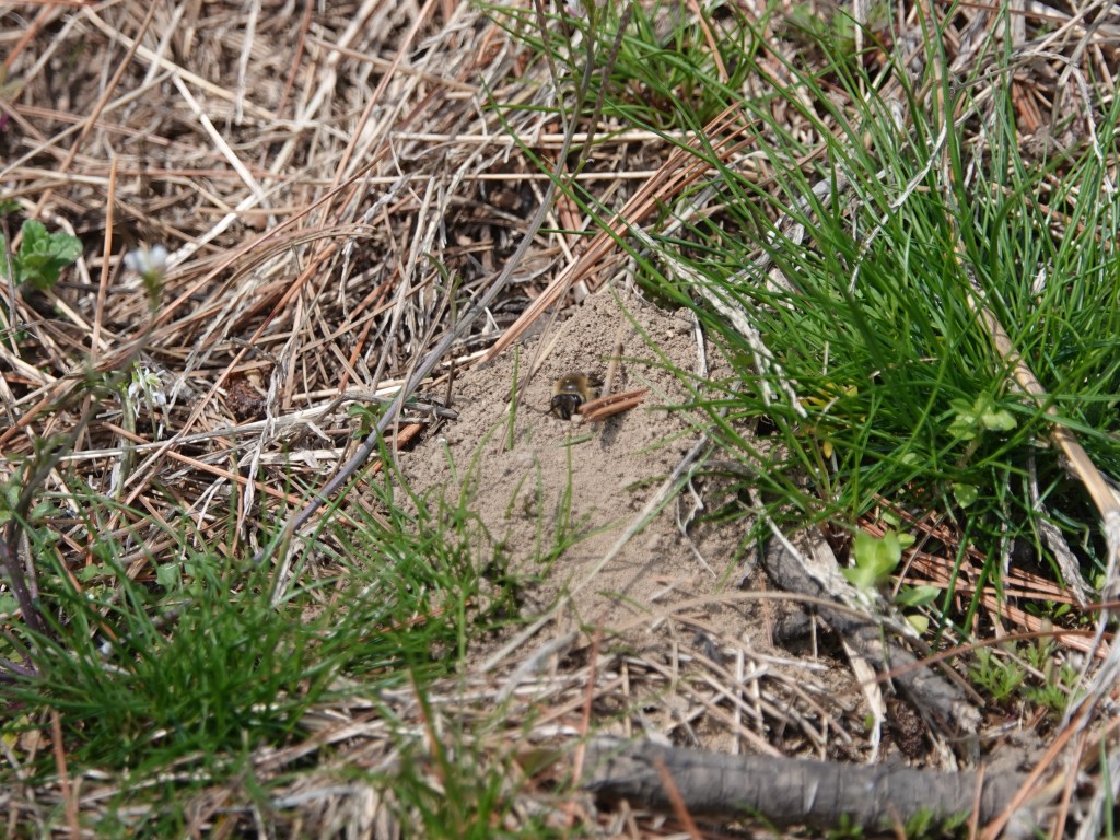 And another. Like most of our wild bee species, Cellophane bees are solitary nesters. They may aggregate their nests in suitable terrain. There are three in a span of some 15-20 feet here. They’re “cellophane” bees because they coat the inside of their nests with an extruded cellophane-like material that waterproofs their egg chambers.