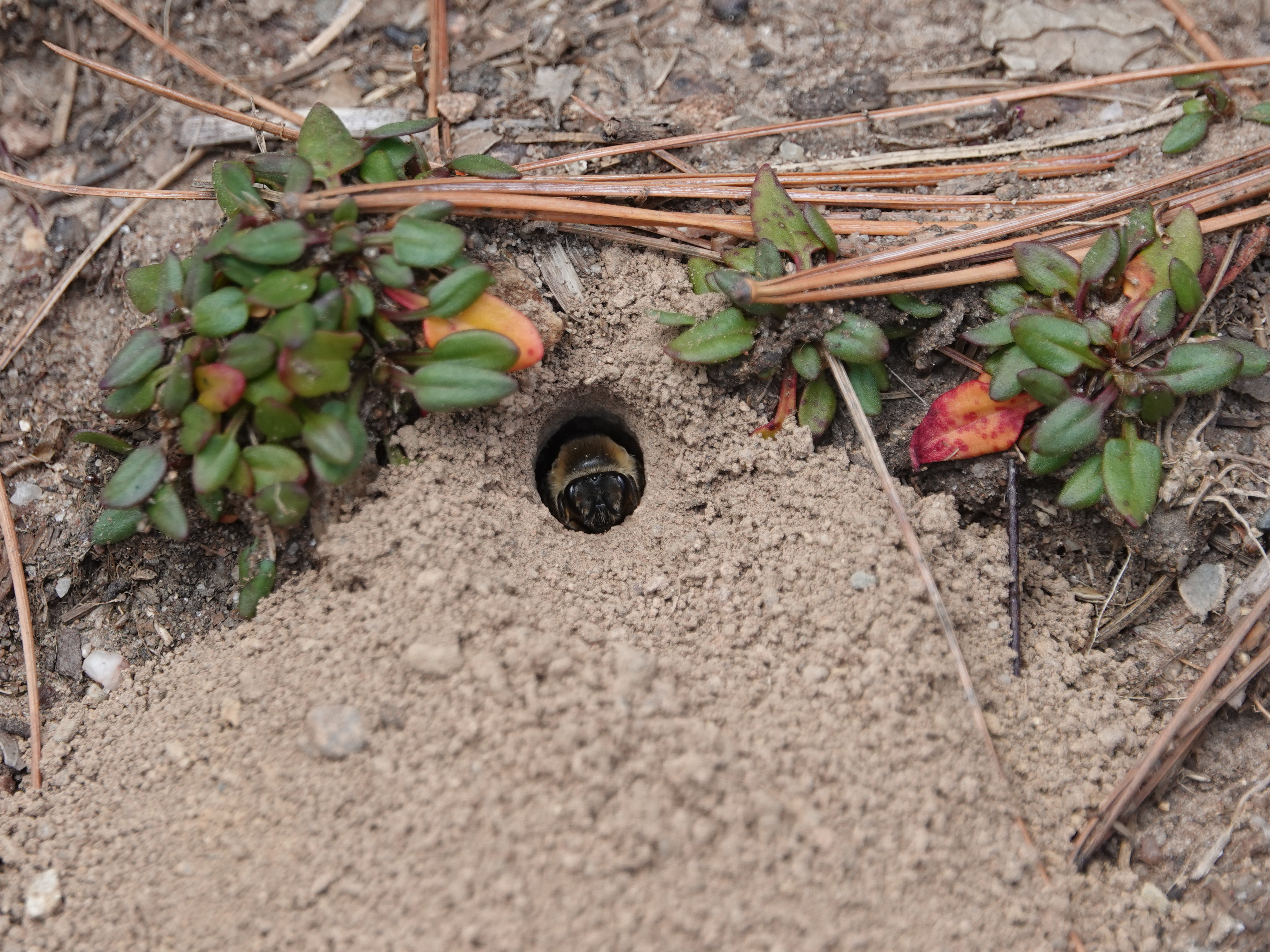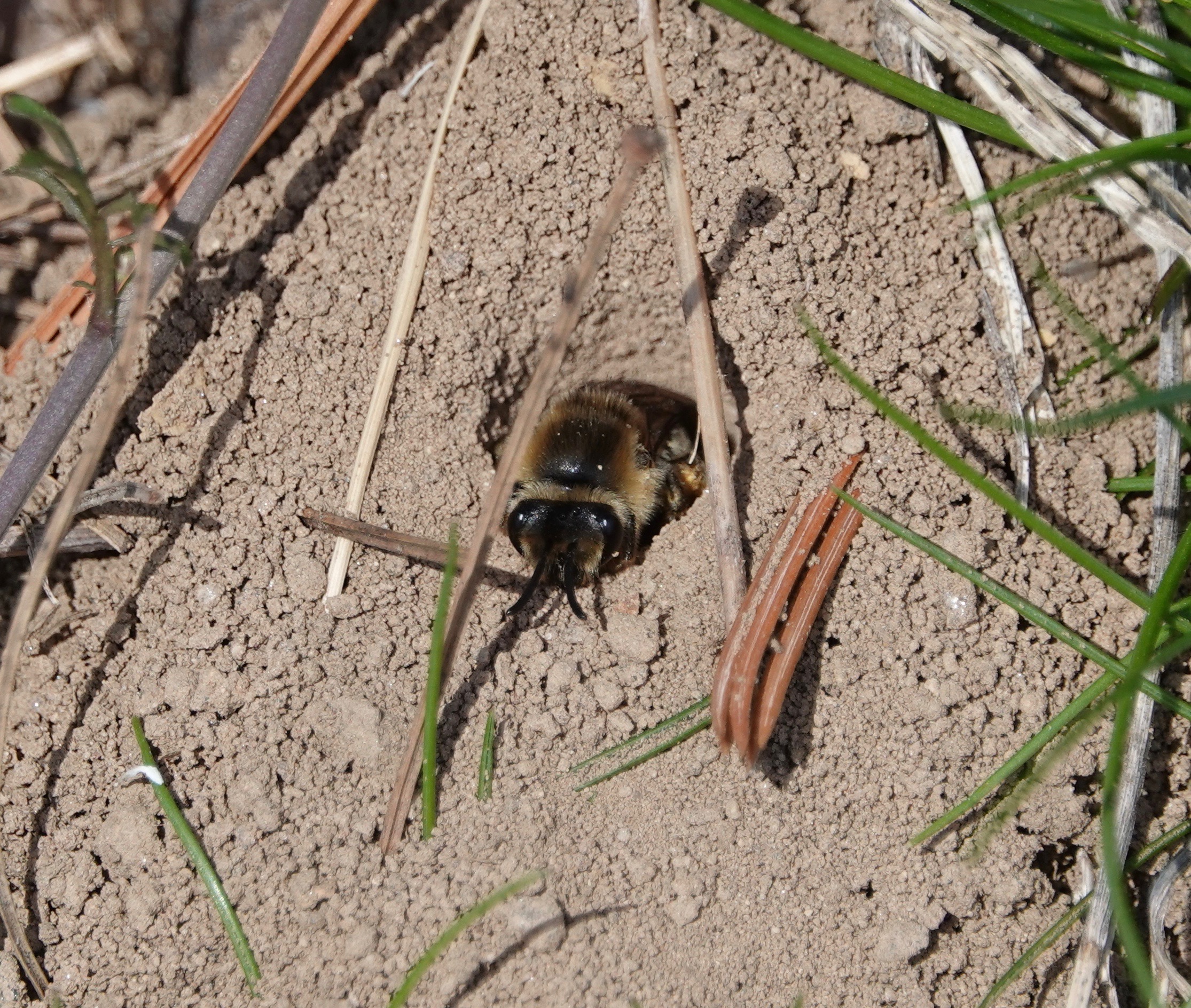 I had to come back another day to see her in there. Unequal Cellophane Bee/Colletes inaequalis.