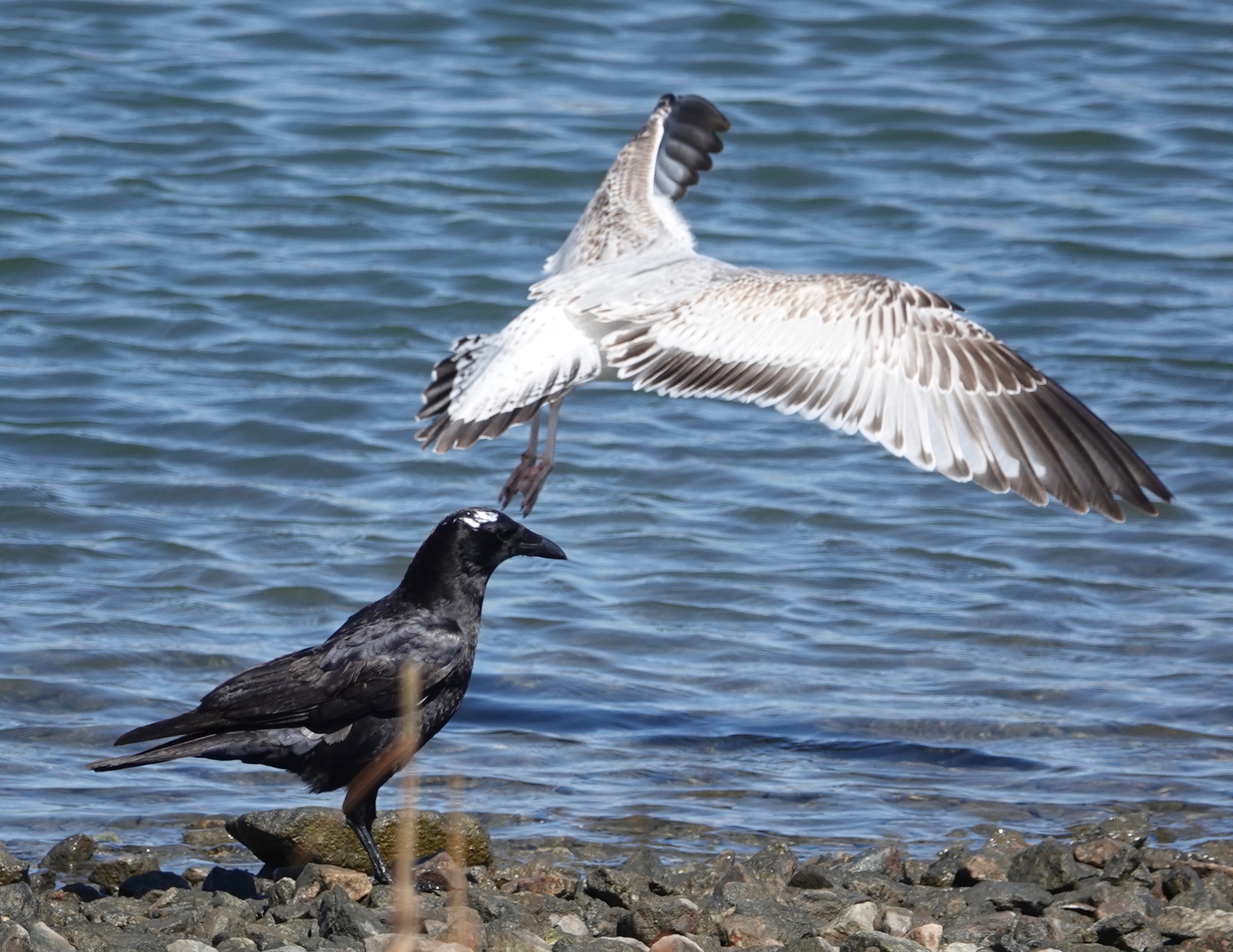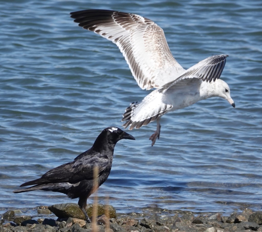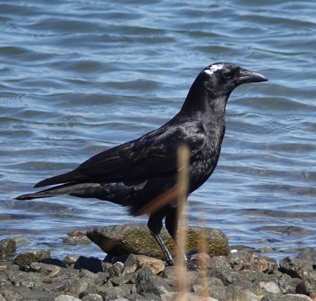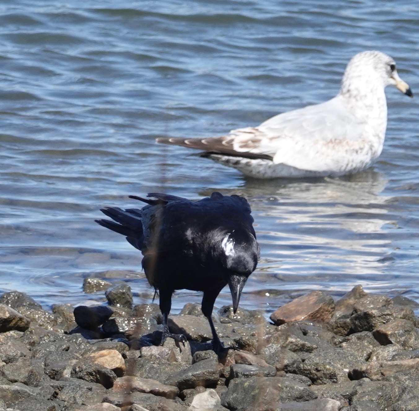 Unique white feathers as eyebrow on this corvid. Note sure if this is a Fish or an American Crow. Usually Fish predominate down here at the city’s edge, but I did hear an American just before spotting this one.