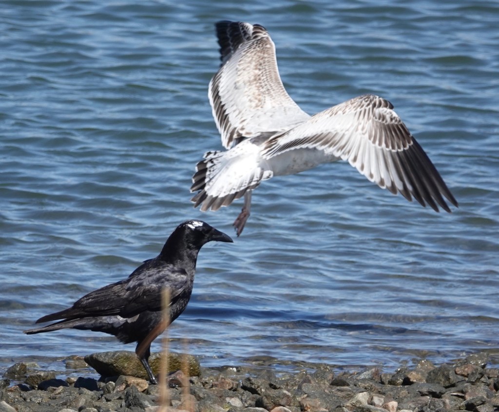 Ring-billed Gull, a fellow scavenge, enters the scene. (Actually, off-stage there are several.)